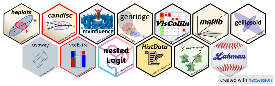 I maintain over 15 R packages for multivariate analysis, categorical data analysis, and historical datasets. These packages emphasize visualization and understanding of statistical methods.