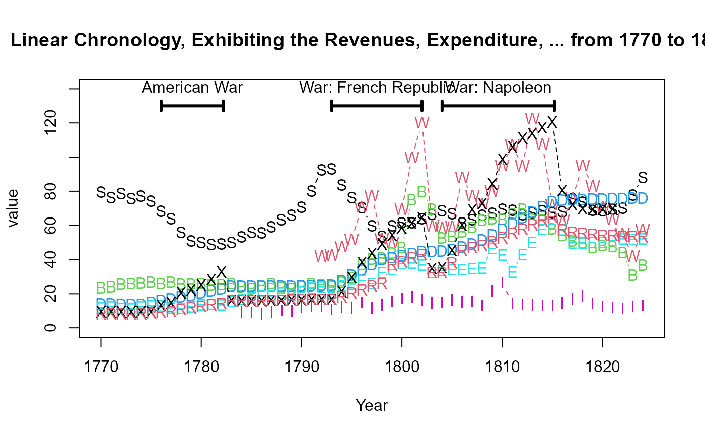 Data from William Playfair's (1824) last graph, titled "Linear Chronology, Exhibiting the Revenues, Expenditure, Debt, Price of Stocks and Bread, from 1770 to 1824". The chart tracks multiple economic variables, including national debt, exports, imports, revenue, expenditure, the price of stocks, and the price of bread over a 154 year time span.
