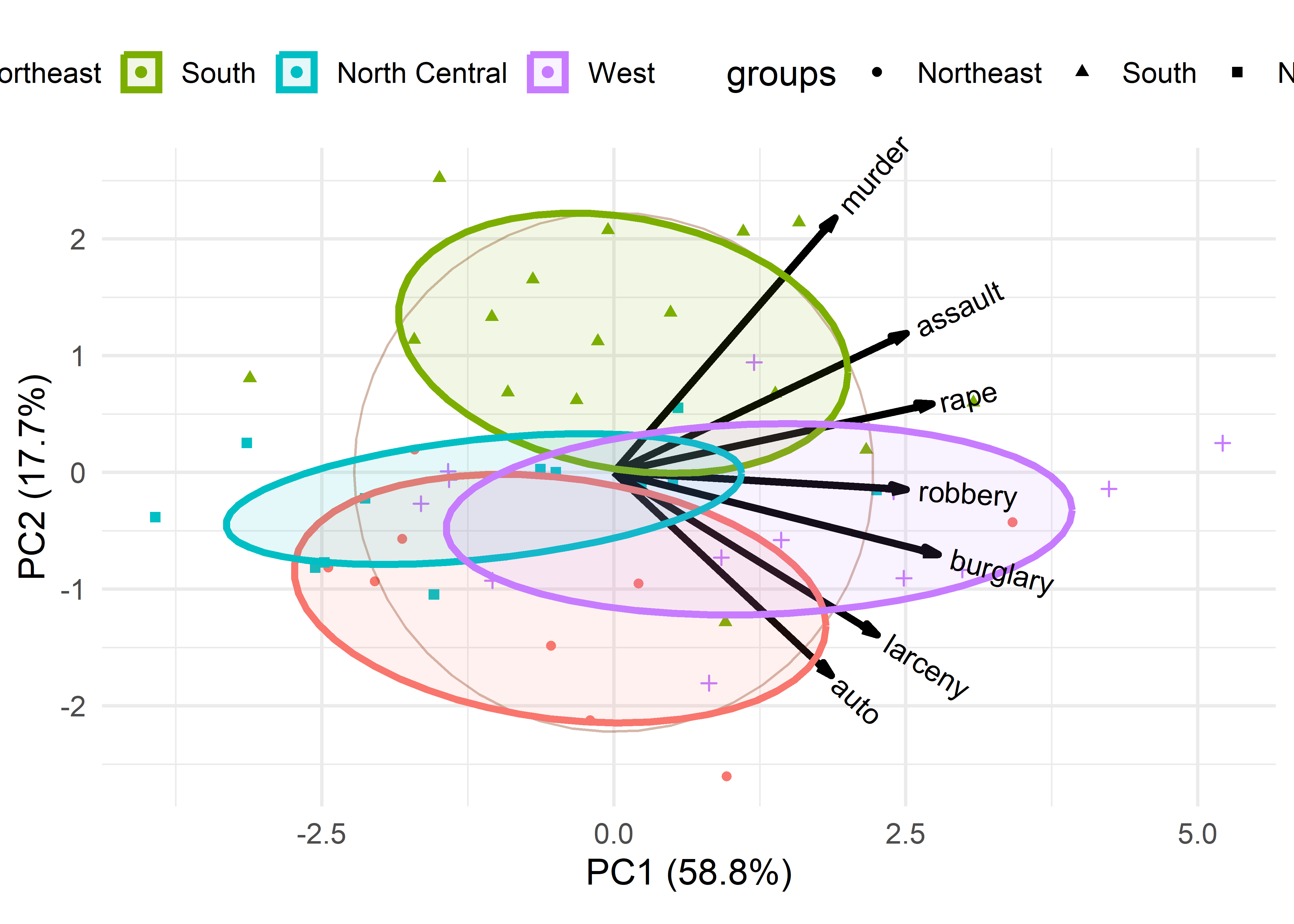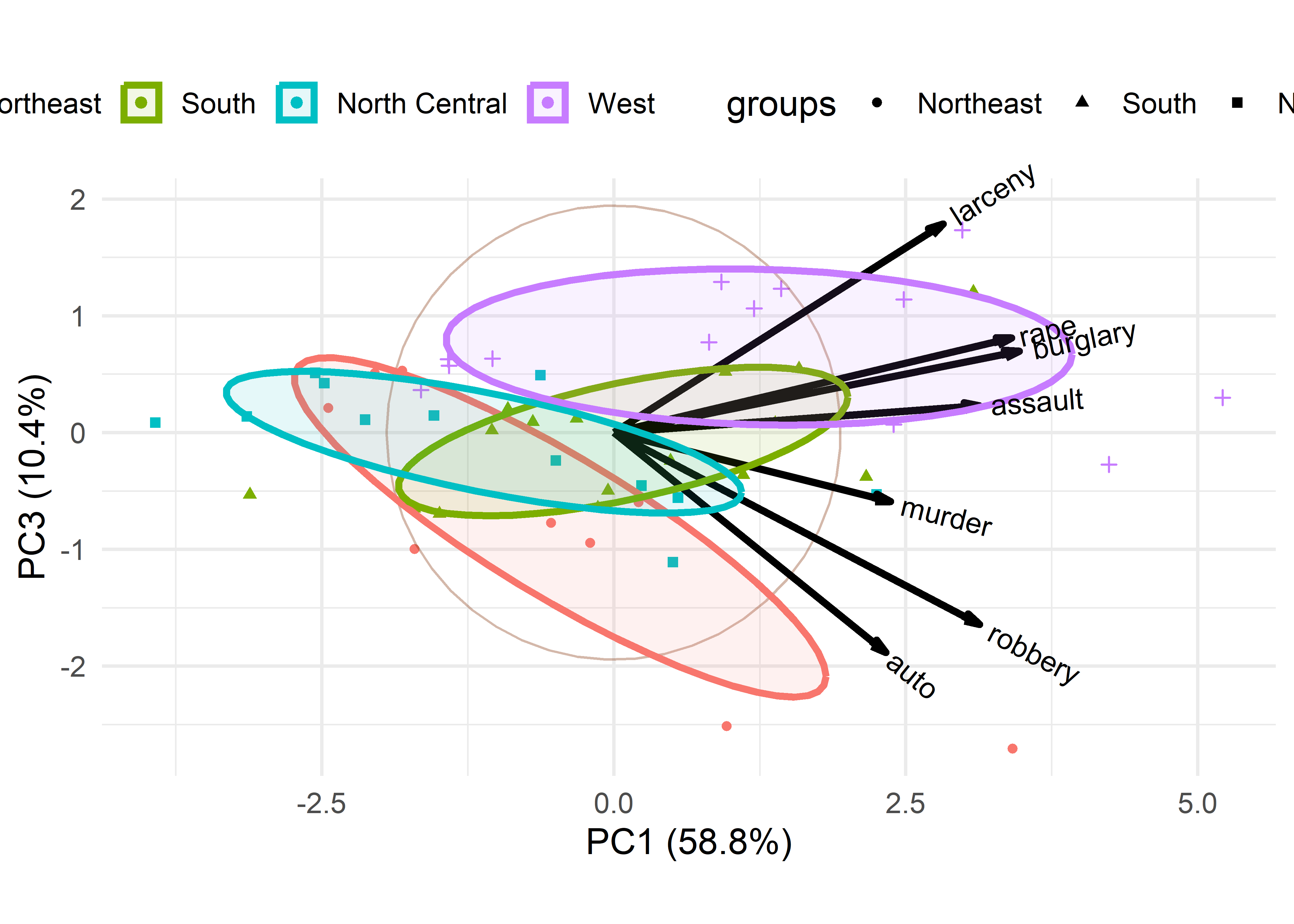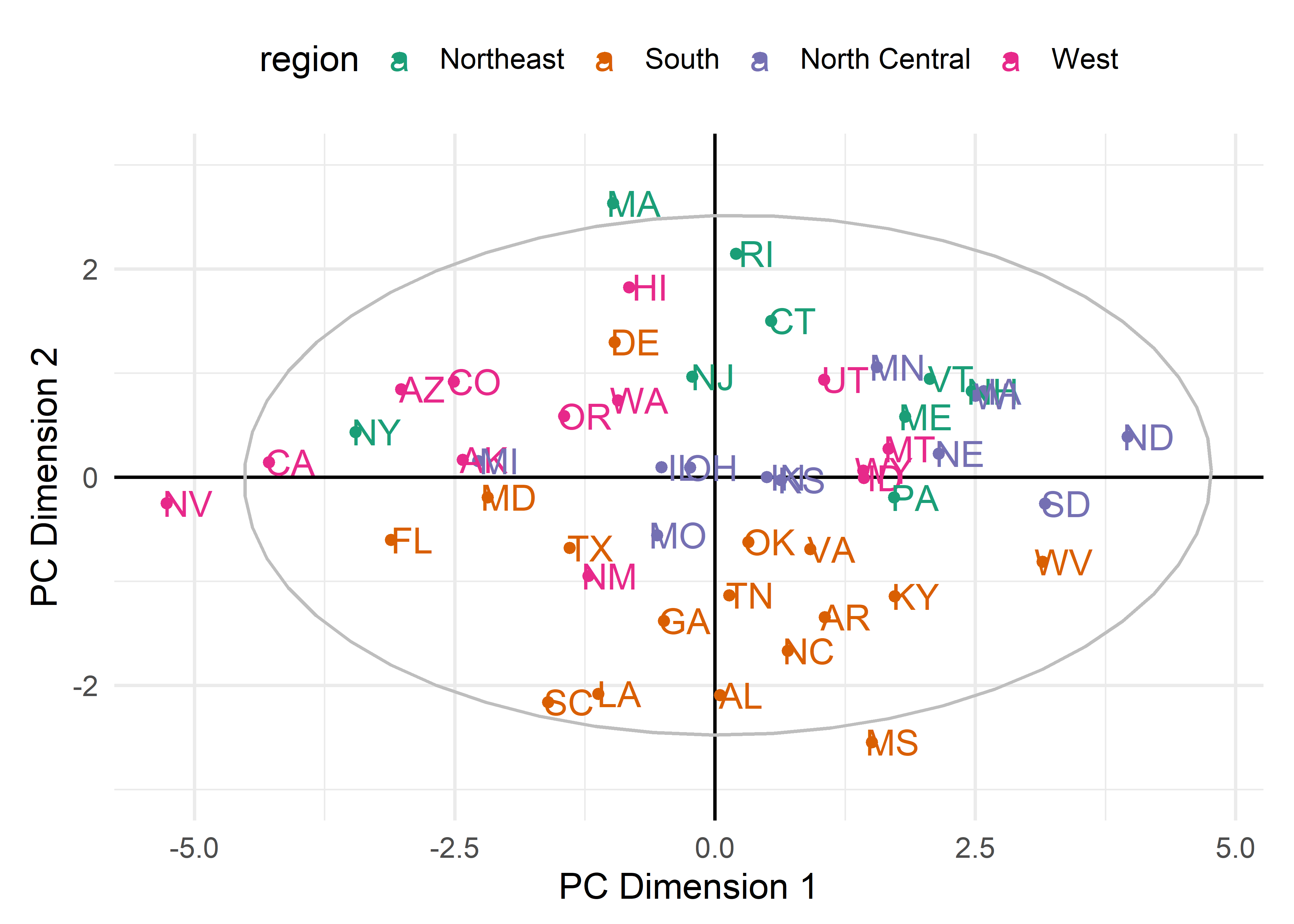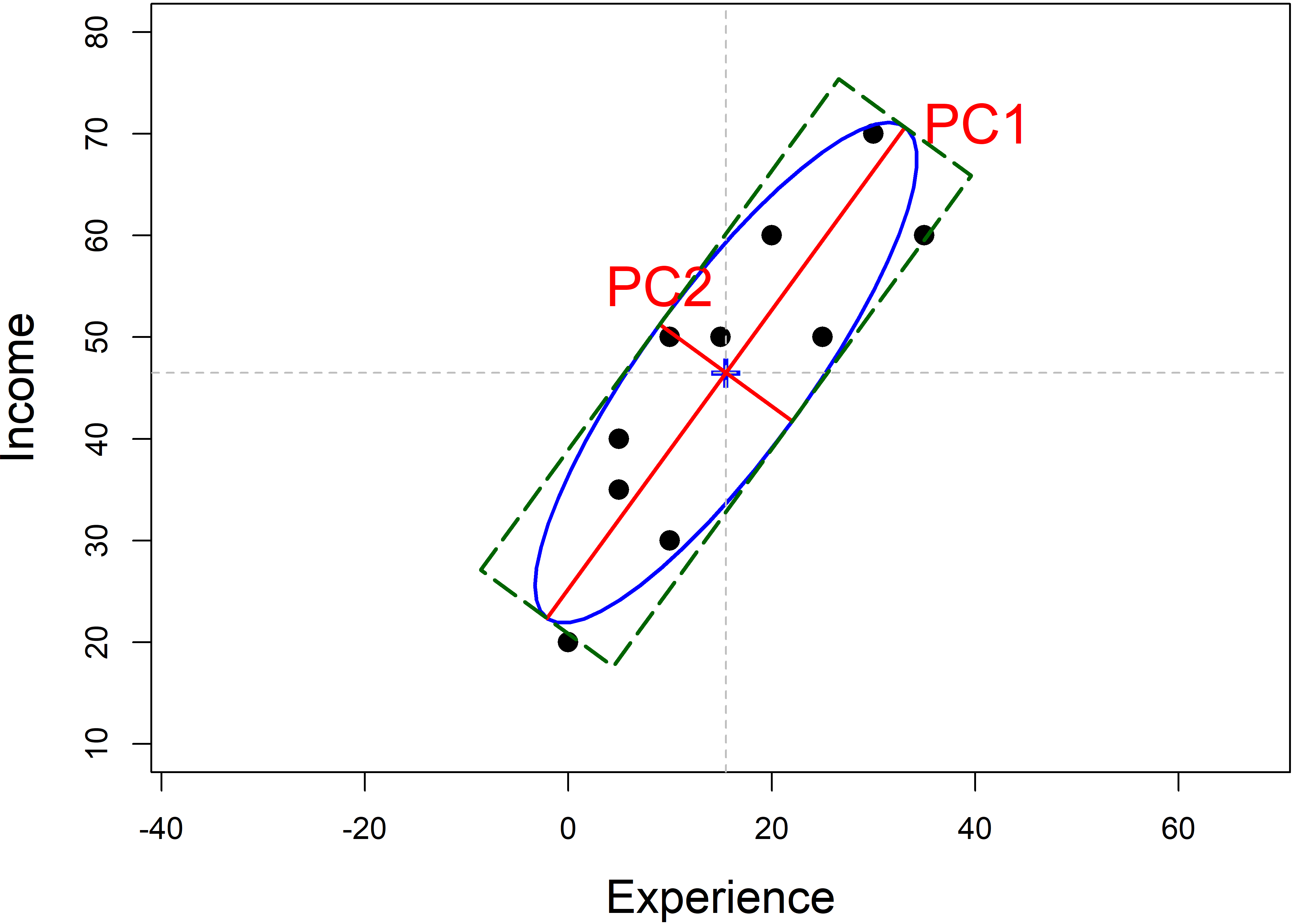 The data ellipse (Section 4.2), or ellipsoid in more than 2D is fundamental in regression. But, as Pearson showed, it is also key to understanding principal components analysis, where the principal component directions are simply the axes of the ellipsoid of the data. As such, observations that are unusual in data space may not stand out in univariate views of the variables, but will stand out in principal component space, usually on the smallest dimension.