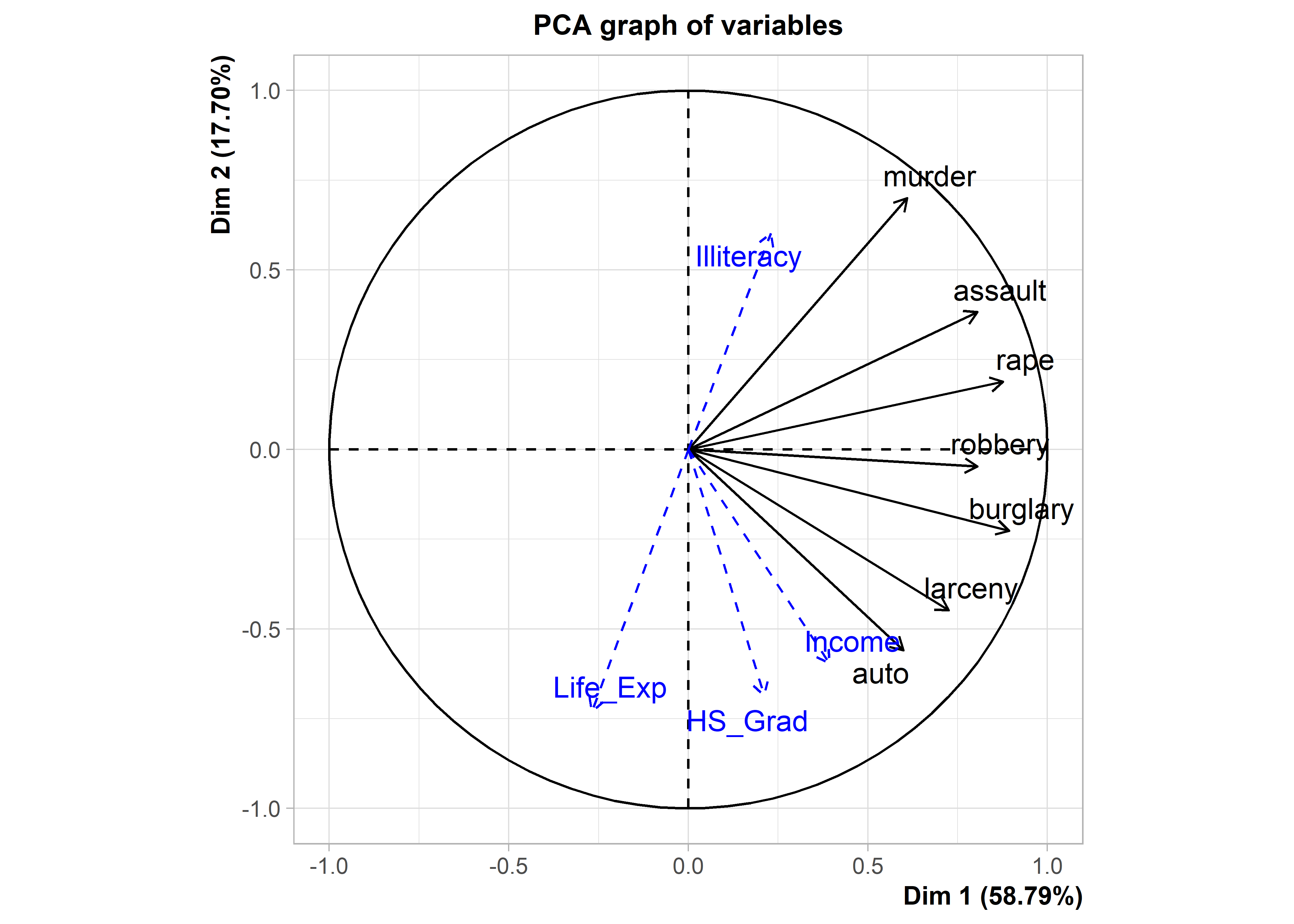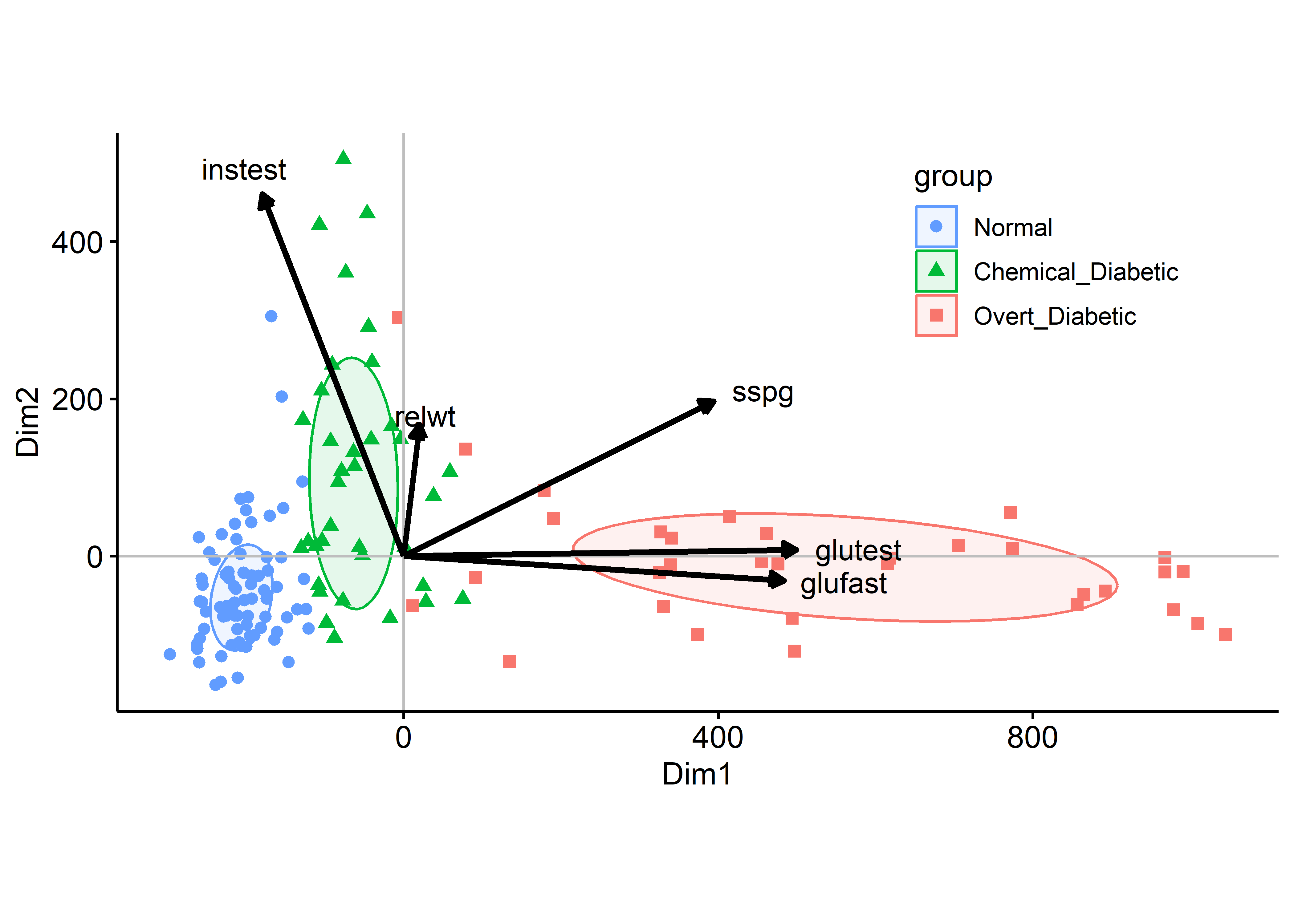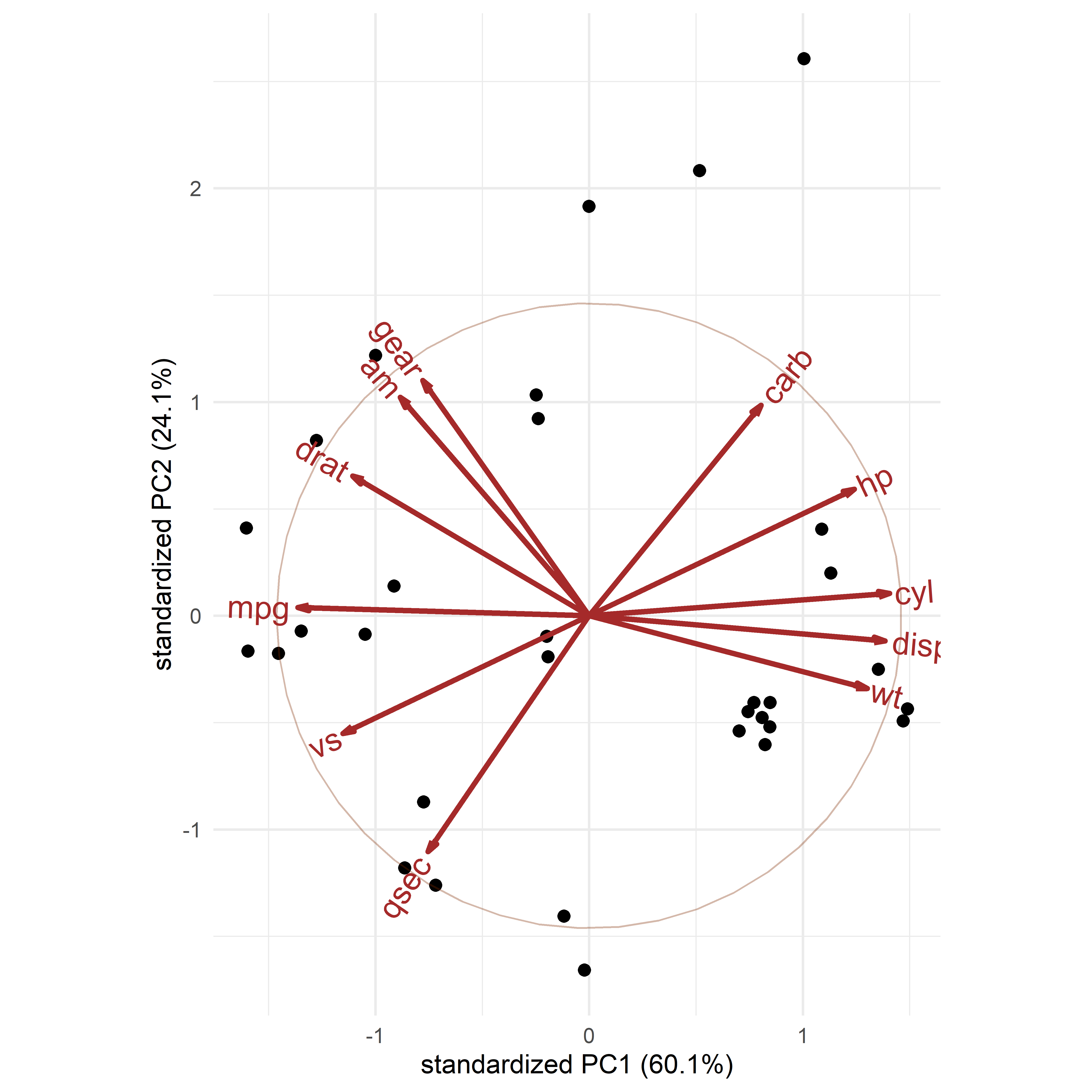 The idea of a biplot, showing the data points in the plane, together with thick pointed arrows—variable vectors— in one view is the other topic explained in this chapter (Section 5.3). The biplot is the simplest example of a multivariate juicer. The essential idea is to project the cloud of data points in \(n\) dimensions into the 2D space of principal components and simultaneously show how the original variables relate to this space. For exploratory analysis to get an initial, incisive view of a multivariate dataset, a biplot is often my first choice.