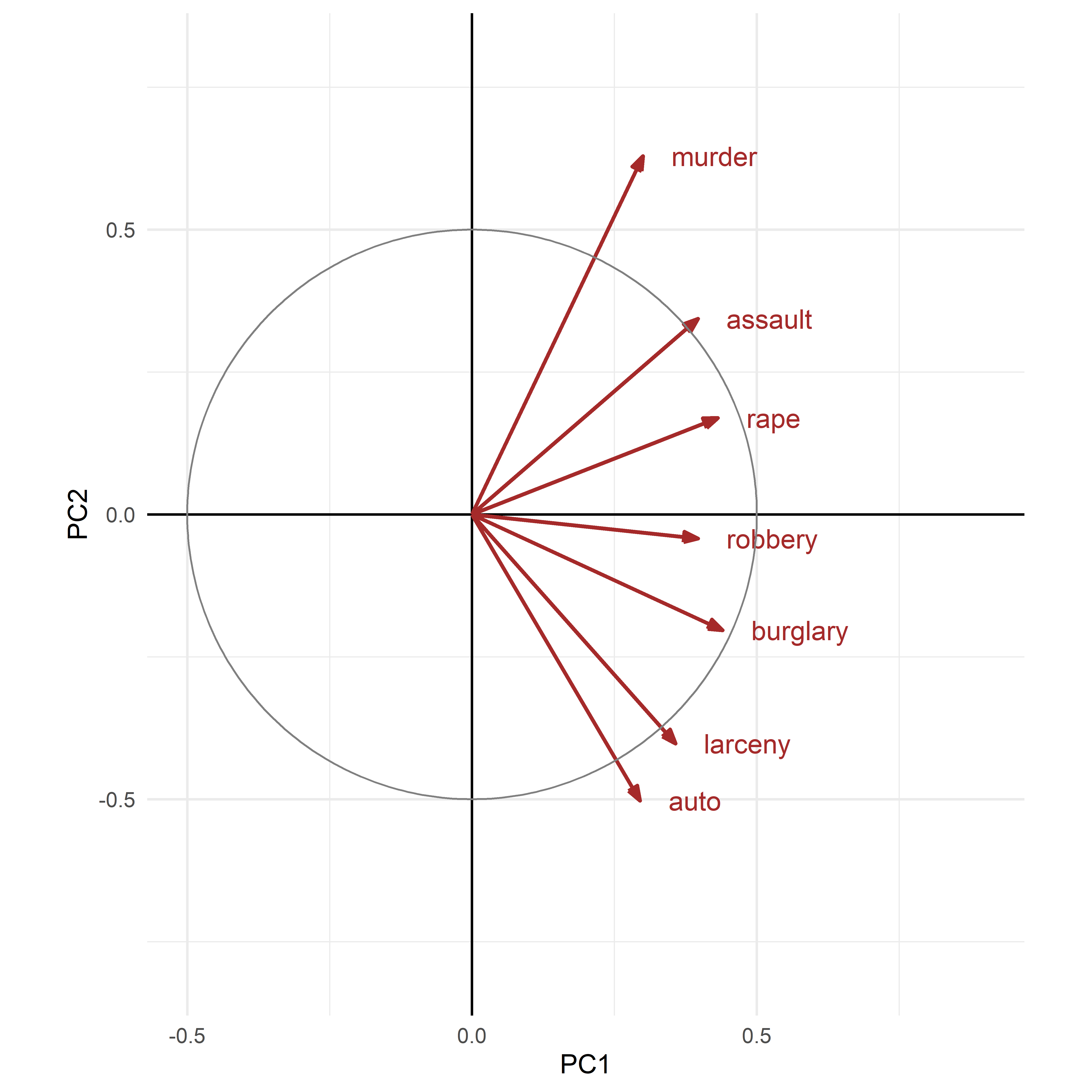 The column \(\mathbf{v}_i\) gives the weights applied to the variables to produce the scores on the \(i\)-th principal component _i$. For example, the first principal component is the weighted sum: