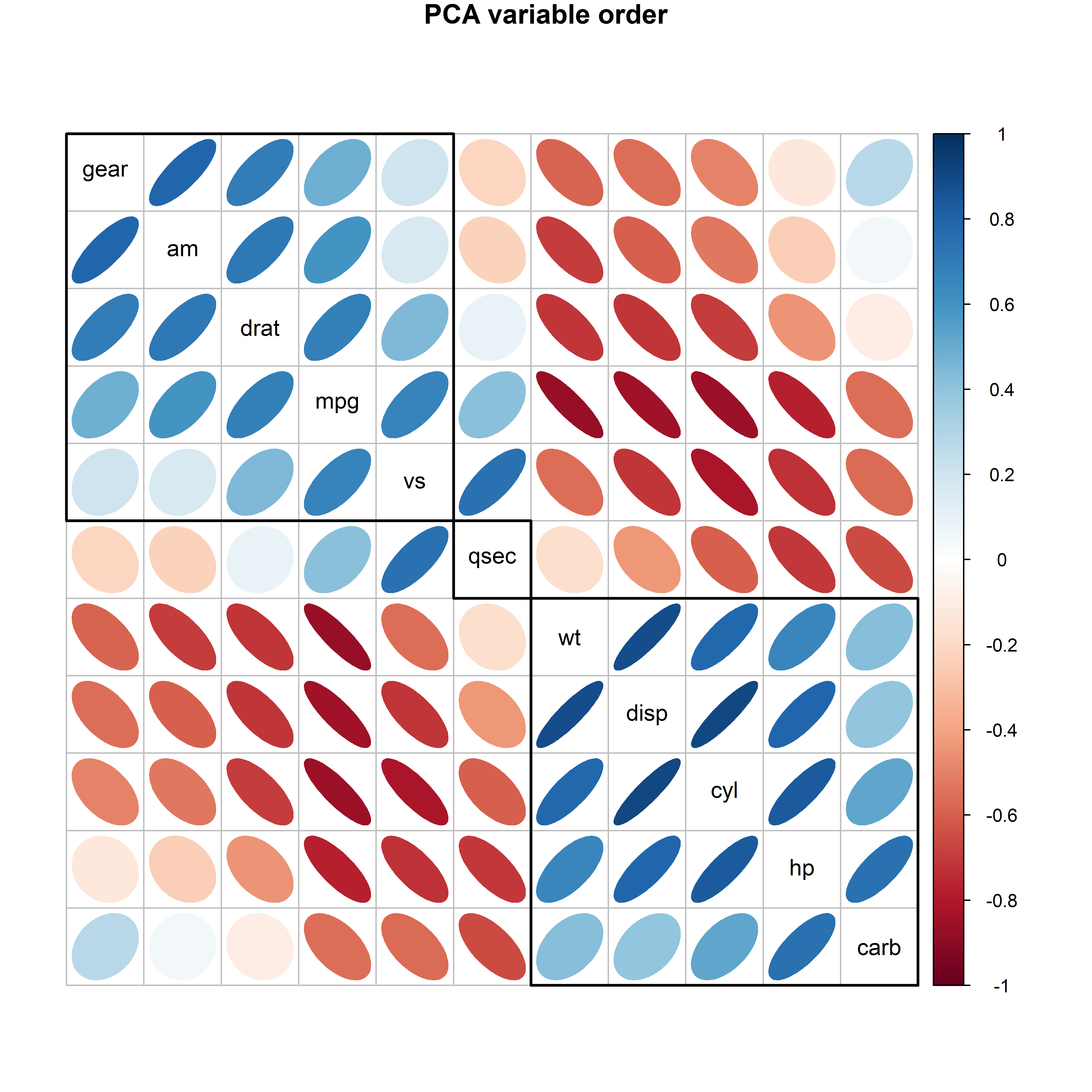 • Variable ordering creates visual clarity: When similar variables are placed adjacent to each other, patterns emerge and anomalies become visible—it’s like organizing a messy bookshelf by subject. In biplots, the angles of variable vectors provide a natural ordering that are used to make correlation matrices and other displays much more interpretable.