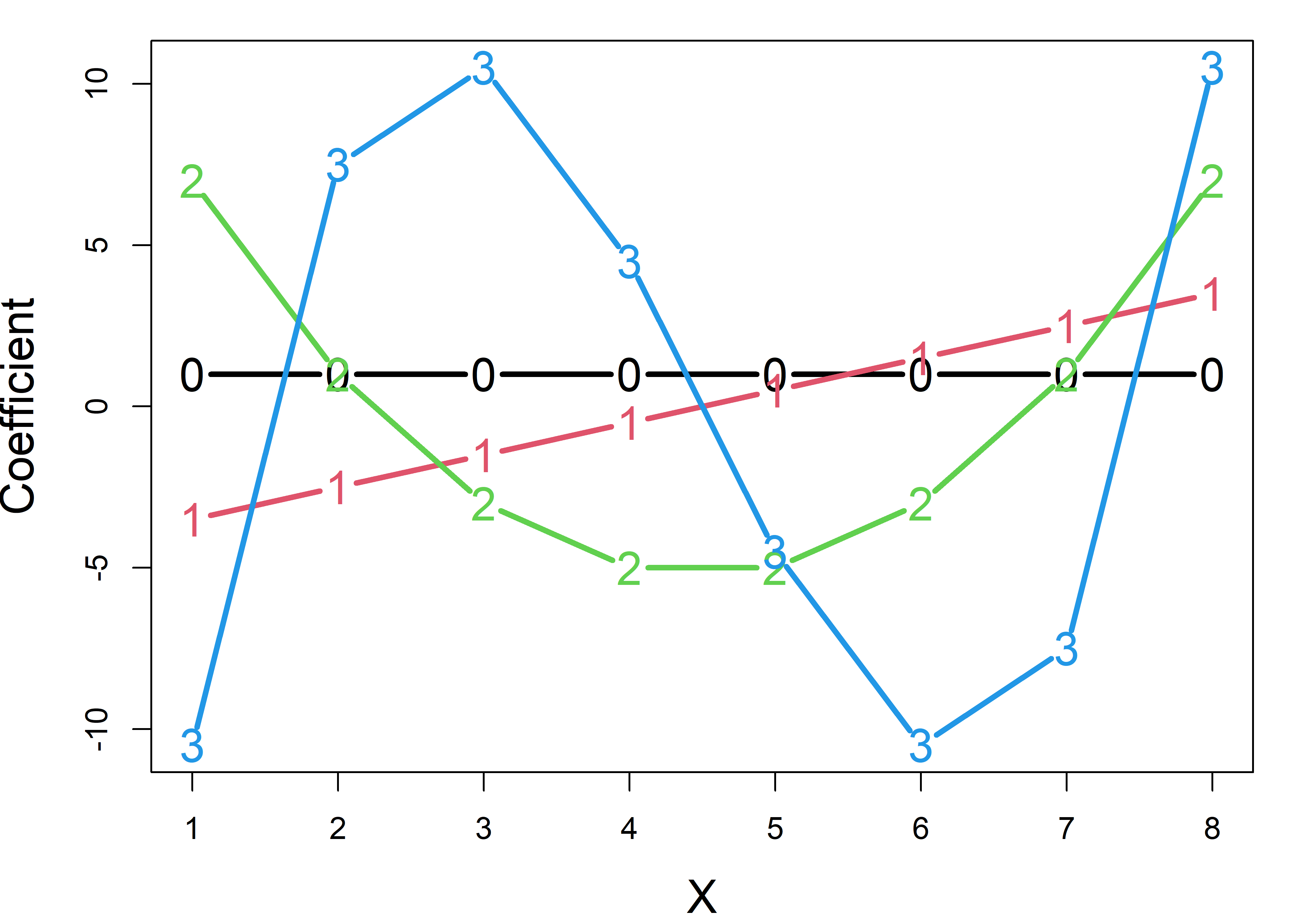 # .C 0 0 1We can get a better sense of orthogonal polynomial contrasts by taking a numeric vector \(x\), and raising it to successive powers, 1, 2, 3. Here \(x^0 = 1\) is the constant term or intercept.