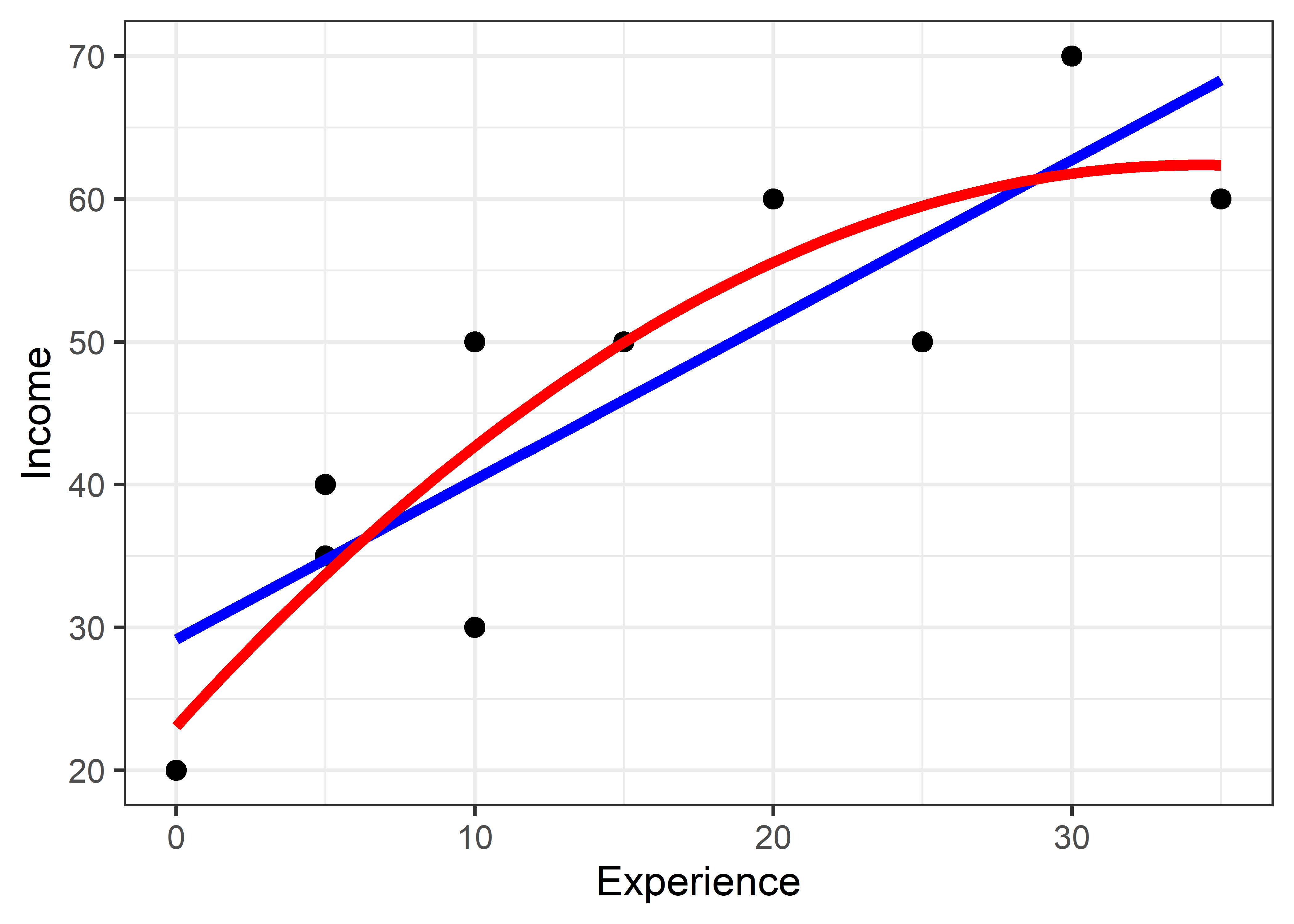 It is simplest to understand these models by plotting the data overlaid with the fitted regressions. This uses geom_smooth() and specifies the smoothing model as method = "lm" with a formula, which is y ~ x for the linear model and y ~ poly(x, 2) for the quadratic.