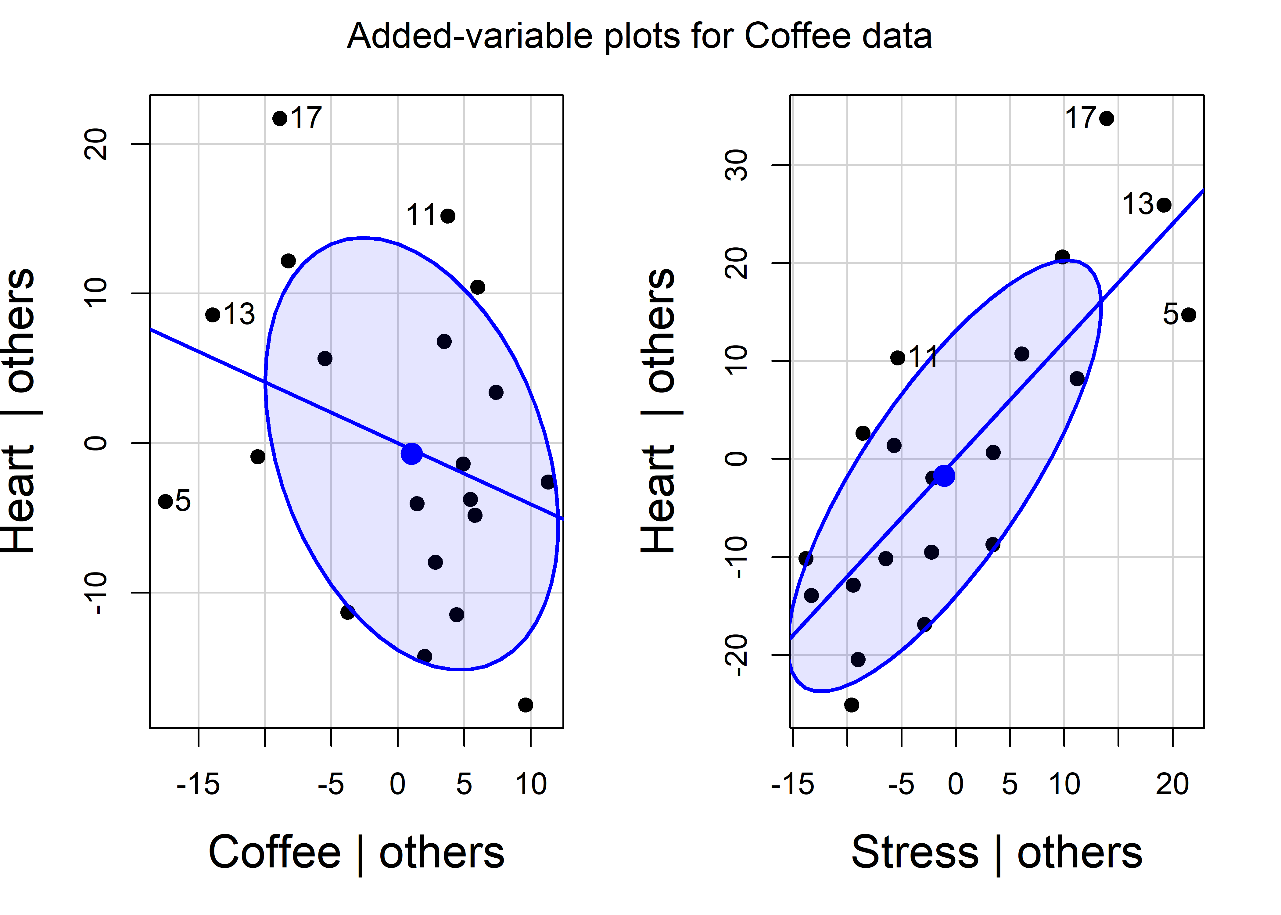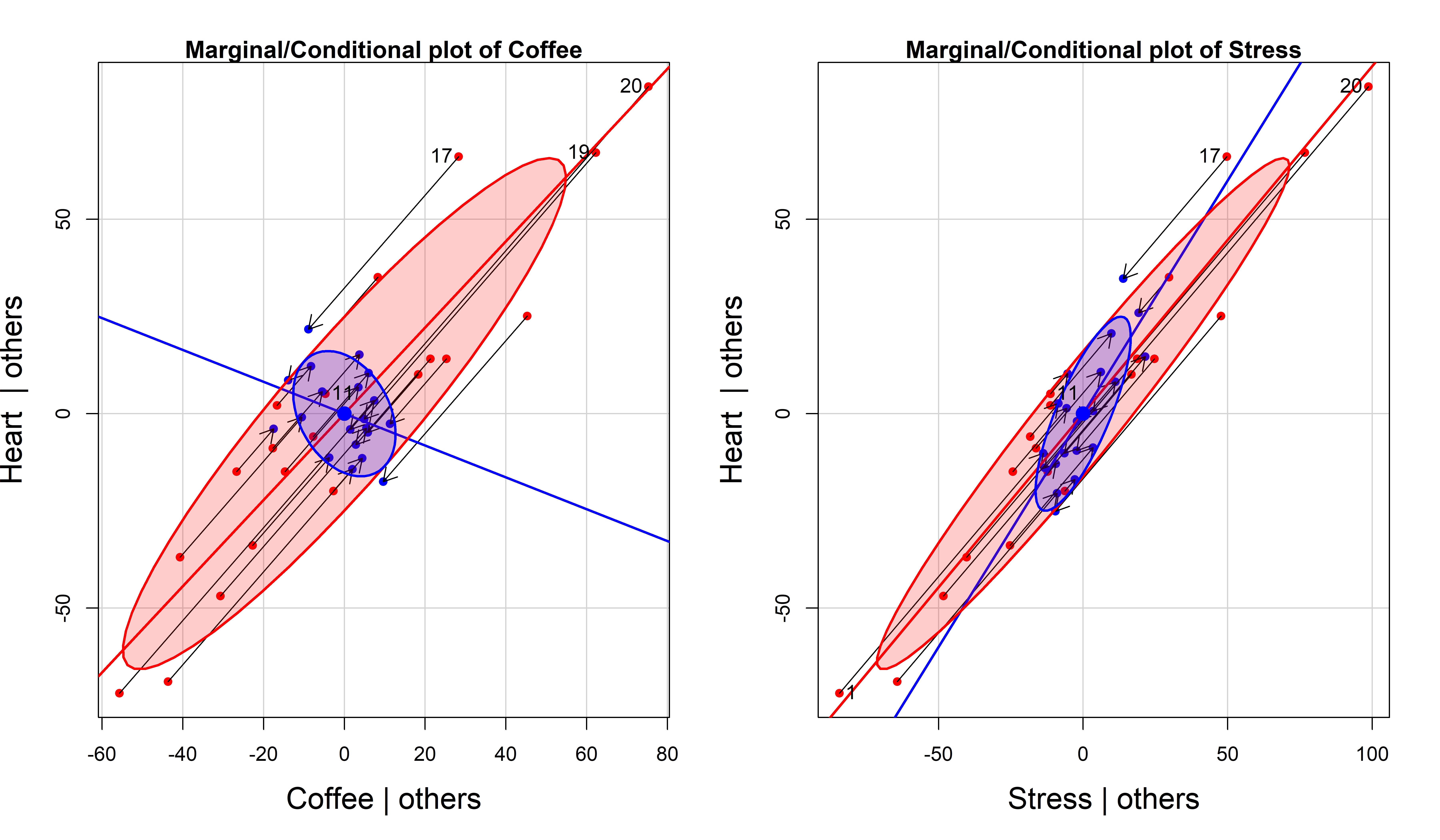 Added-variable plots expose the truth behind “controlling for other variables”: These magical plots perform visual surgery, removing the effects of all other predictors to show the pure relationship between response and focal predictor. They reveal Simpson’s paradox in action–—how coffee can appear harmful marginally but beneficial conditionally when stress is controlled. The relationship between marginal and conditional ellipses tells the complete story of confounding and adjustment.