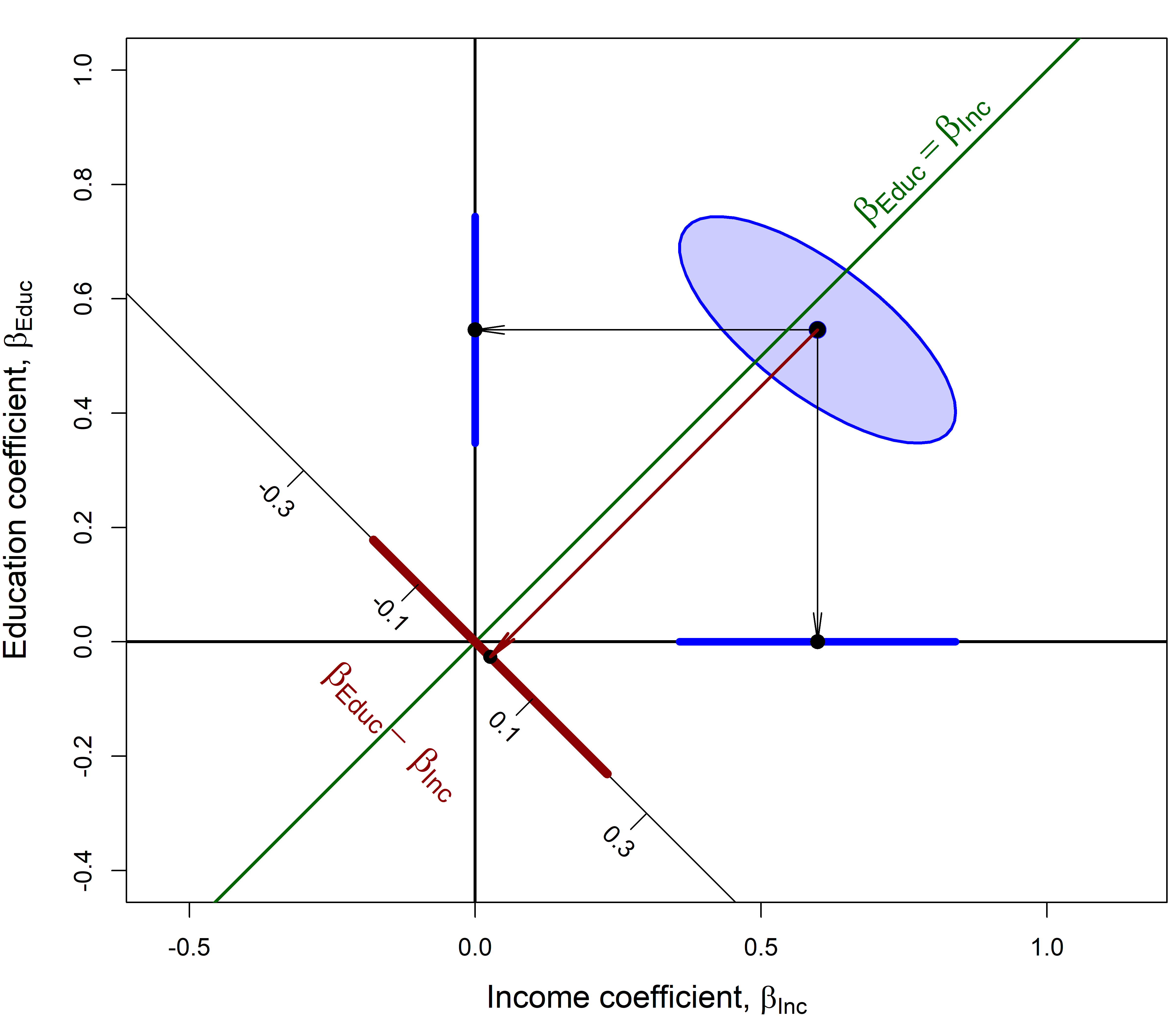 We can visualize this test and confidence intervals using a joint confidence ellipse for the coefficients for income and education in the model duncan.mod. In Figure 7.1 the size of the ellipse is set to \(\sqrt{F^{0.95}_{1,\nu}} = t^{0.95}_{\nu}\), so that its shadows on the horizontal and vertical axes correspond to 1D 95% confidence intervals. In this plot, the line through the origin with slope \(= 1\) corresponds to equal coefficients for income and education and the line with slope \(= -1\) corresponds to their difference, \(\beta_{\text{Educ}} - \beta_{\text{Inc}}\). The orthogonal projection of the coefficient vector \((\widehat{\beta}_{\text{Inc}}, \widehat{\beta}_{\text{Educ}})\) (the center of the ellipse) is the point estimate of \(\widehat{\beta}_{\text{Educ}} - \widehat{\beta}_{\text{Inc}}\) and the shadow of the ellipse along this axis is the 95% confidence interval for the difference in slopes.