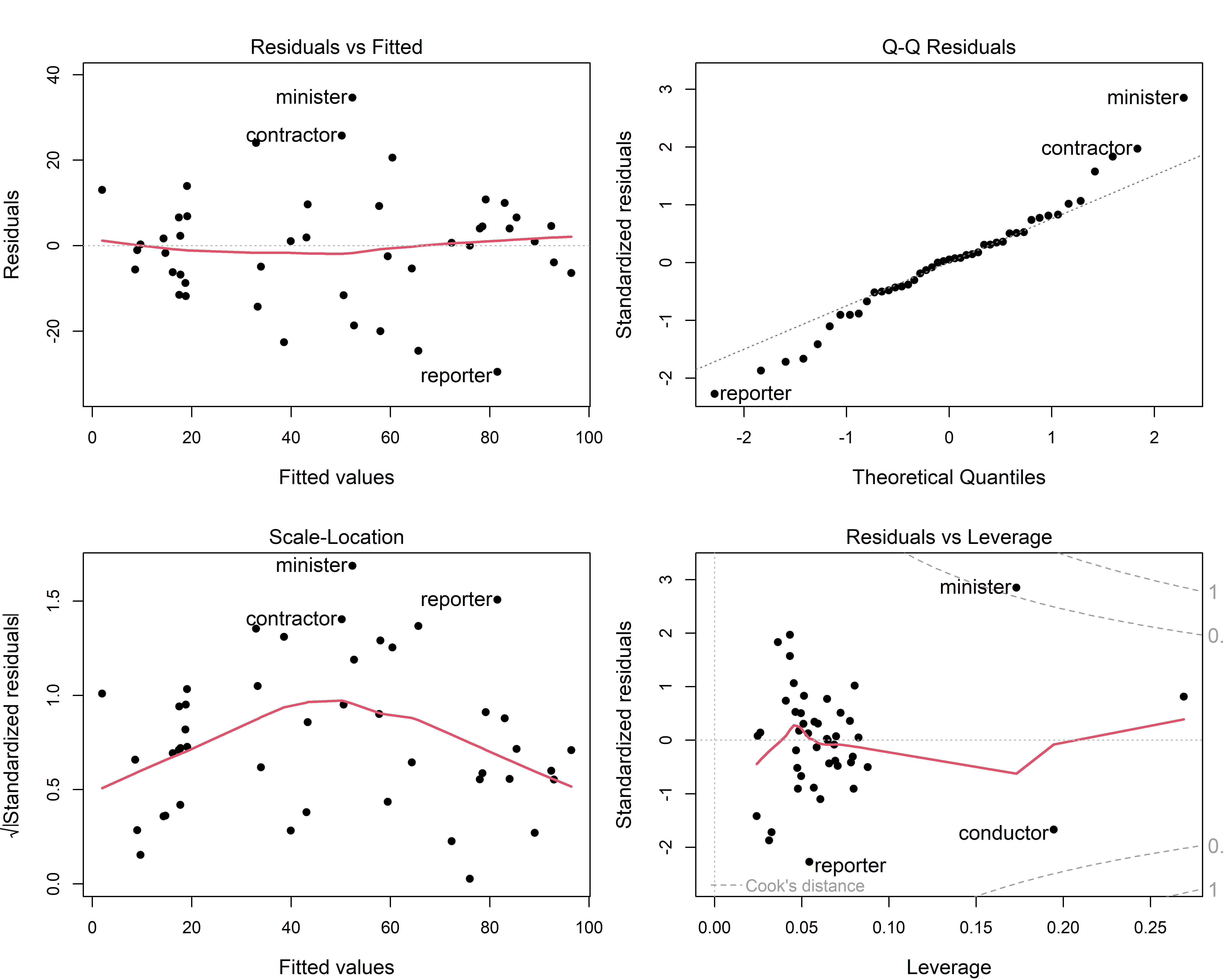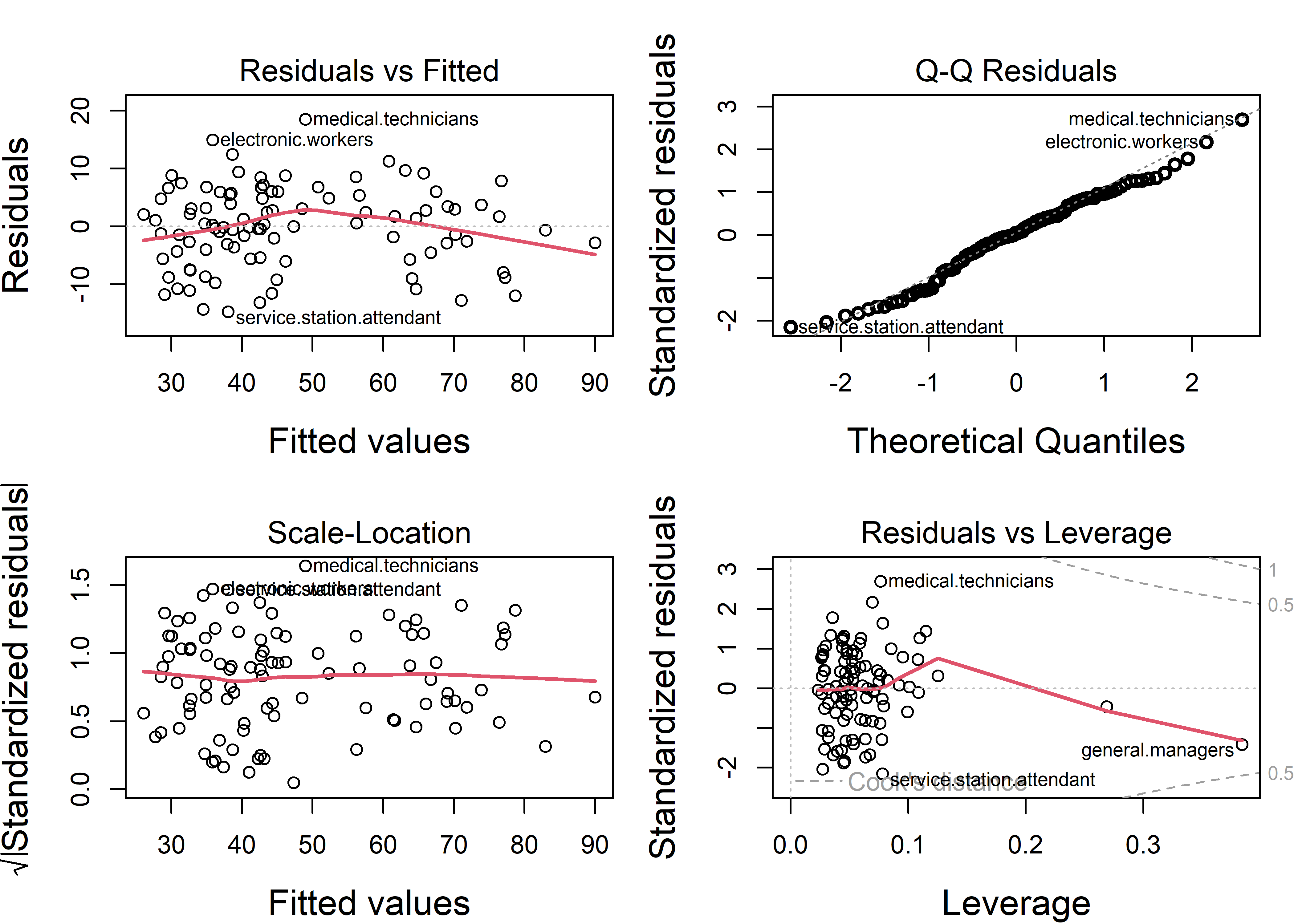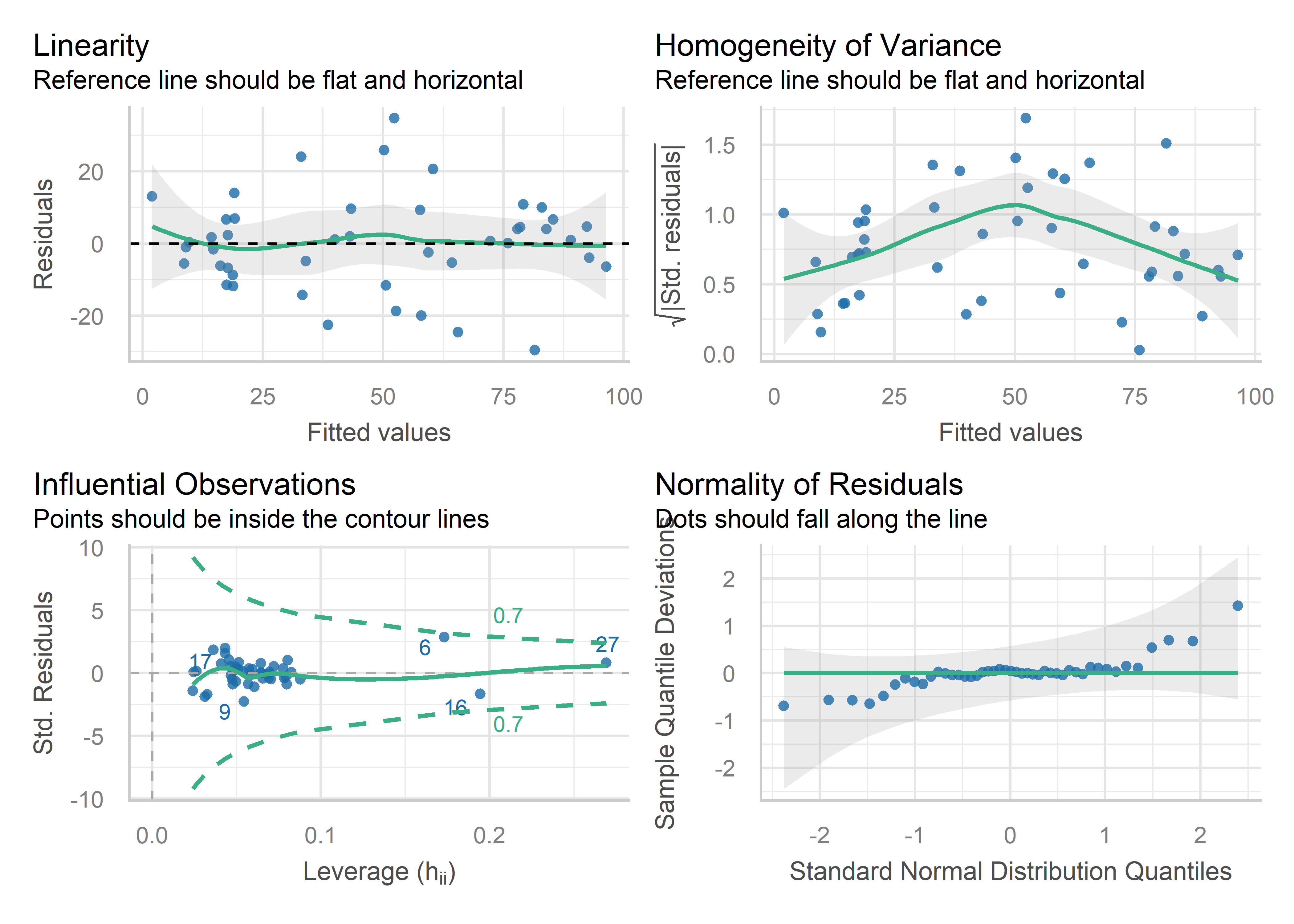 The base-R plot(model) plots are done much better in a variety of packages. I illustrate some versions from the car (Fox & Weisberg, 2019) and performance (Lüdecke et al., 2021) packages, part of the easystats (Lüdecke et al., 2022) suite of packages.