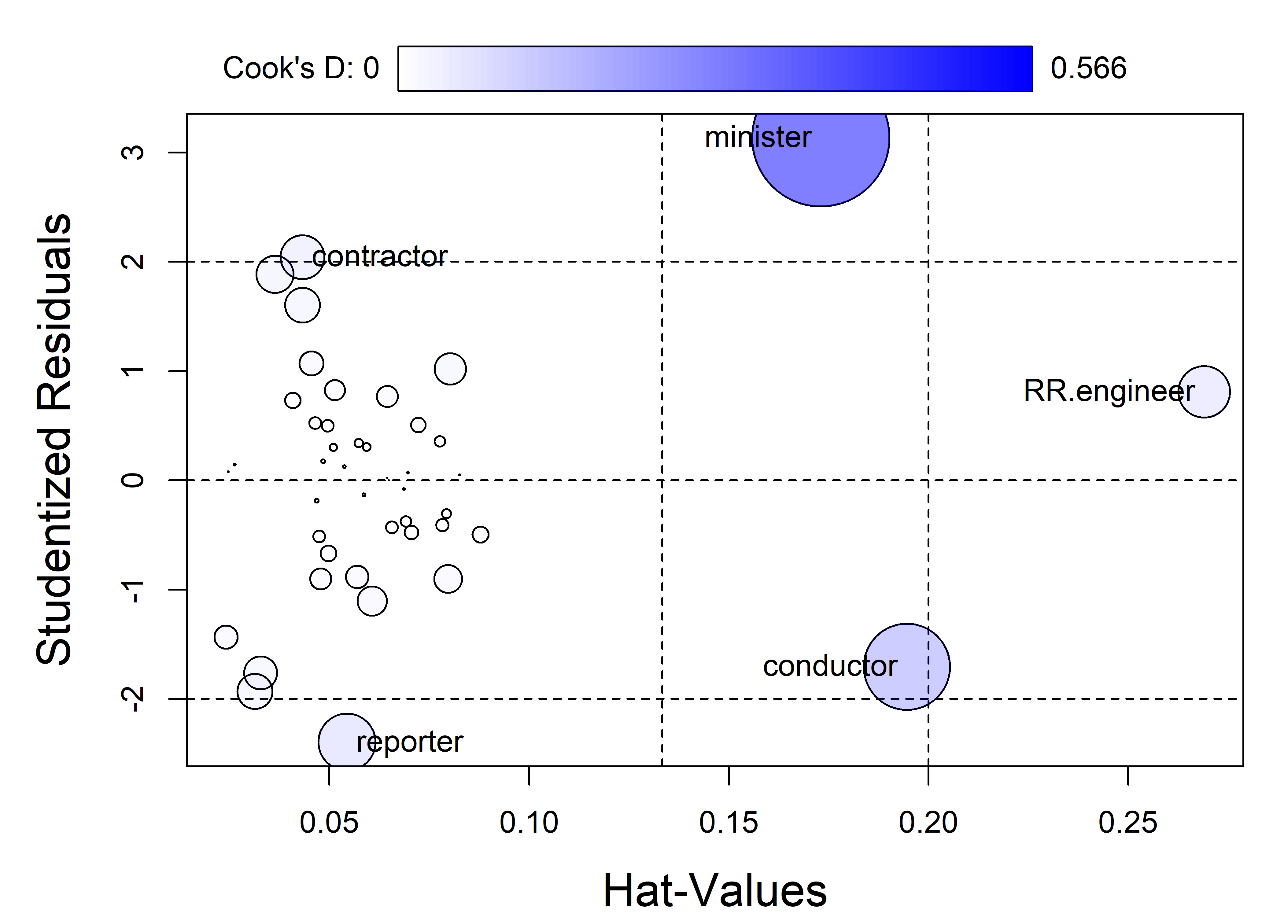 # 5 contractor prof 53 45 76 2.044 0.0433 0.0585minister has by far the largest influence, because it has an extremely positive residual and a large hat value. Looking at the data, we see that ministers have very low income, so their prestige is under-predicted. The large hat value reflects the fact that ministers have low income combined with very high education.