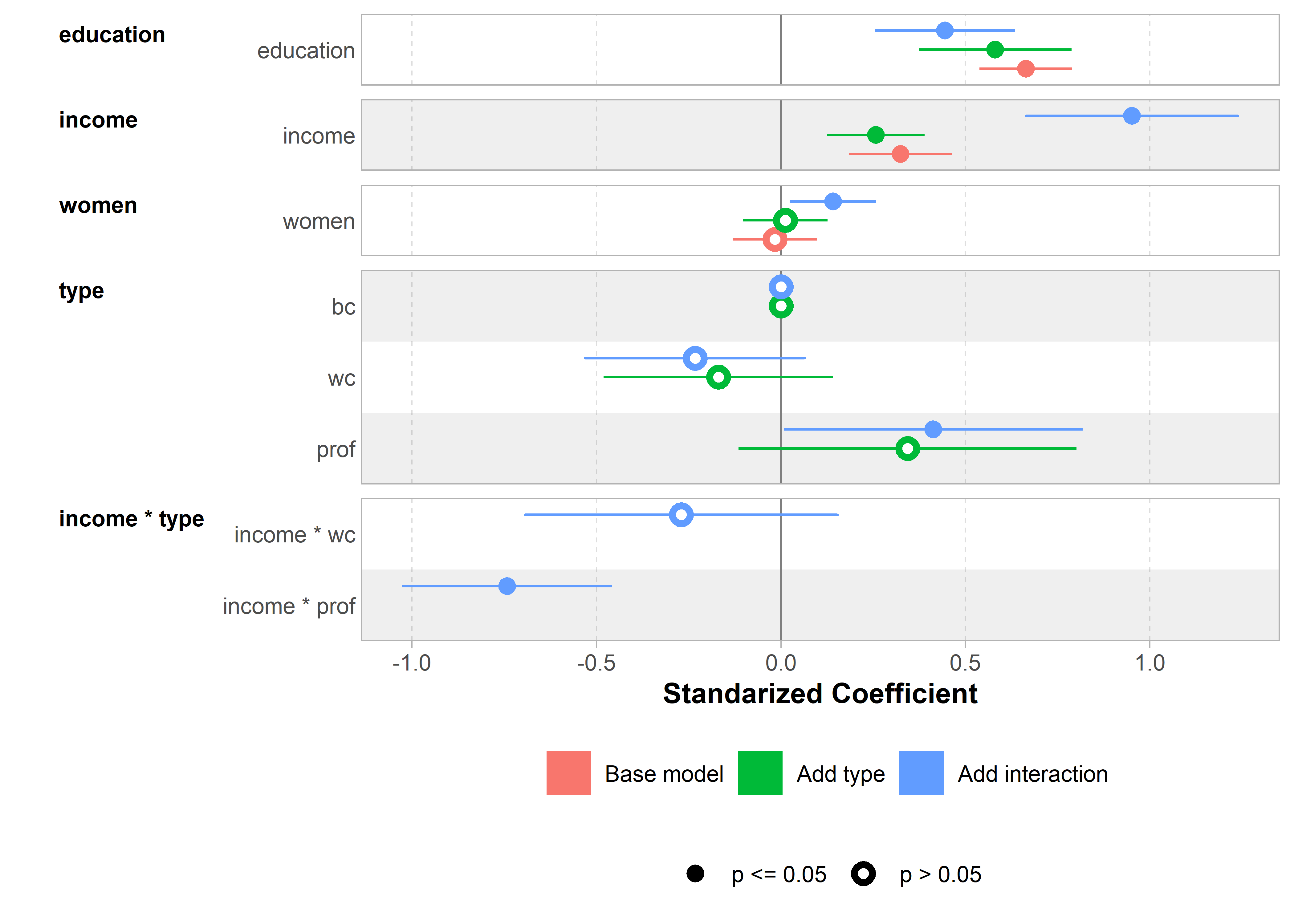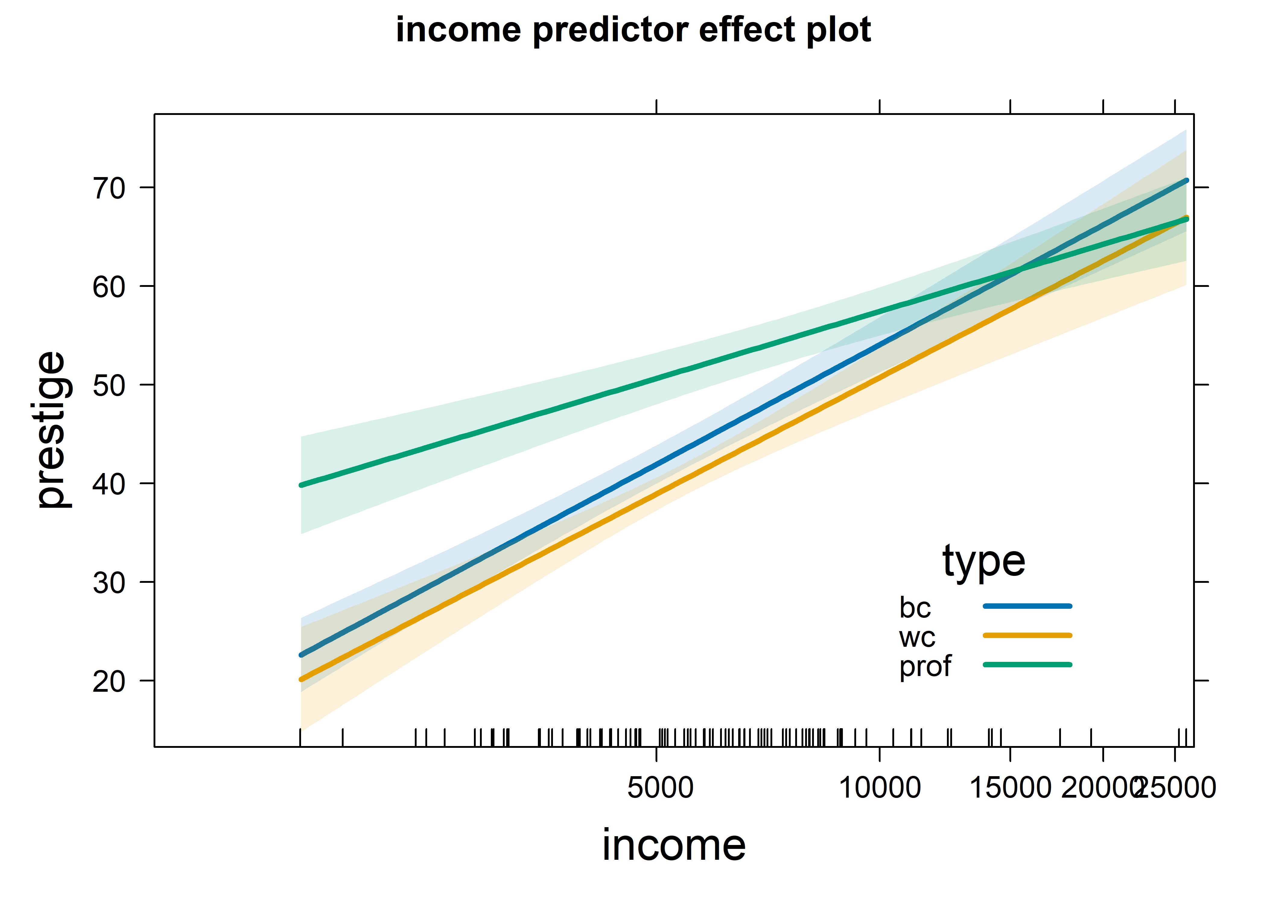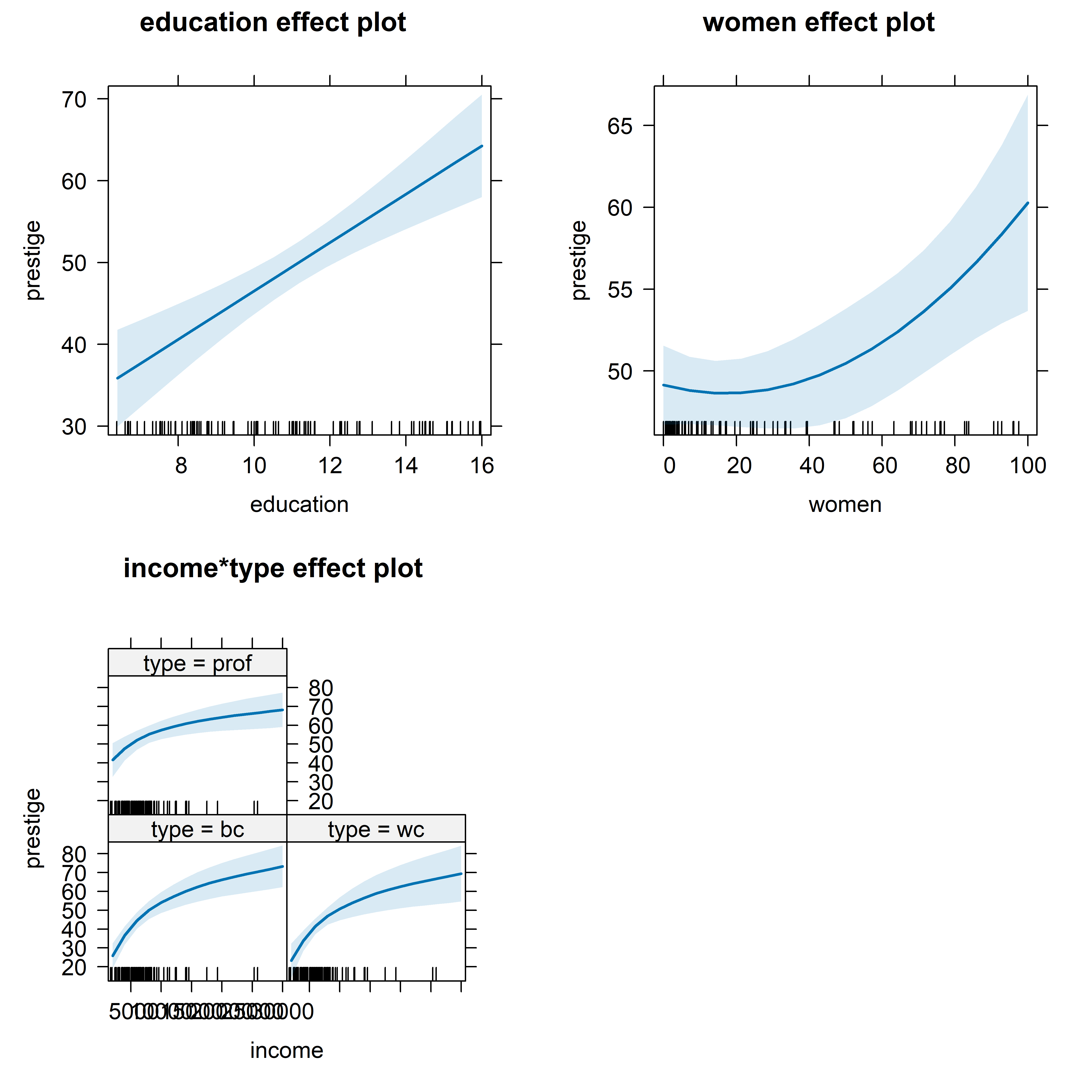 Effect displays translate complex models into understandable stories: When interactions, transformations, and multiple predictors make coefficient interpretation impossible, effect displays come to the rescue. They show exactly how prestige changes with income for different occupation types, or how the effects of education varies across meaningful ranges, controlling for other variables These plots transform “significant at p < 0.05” into “here’s exactly what this means in practice.”