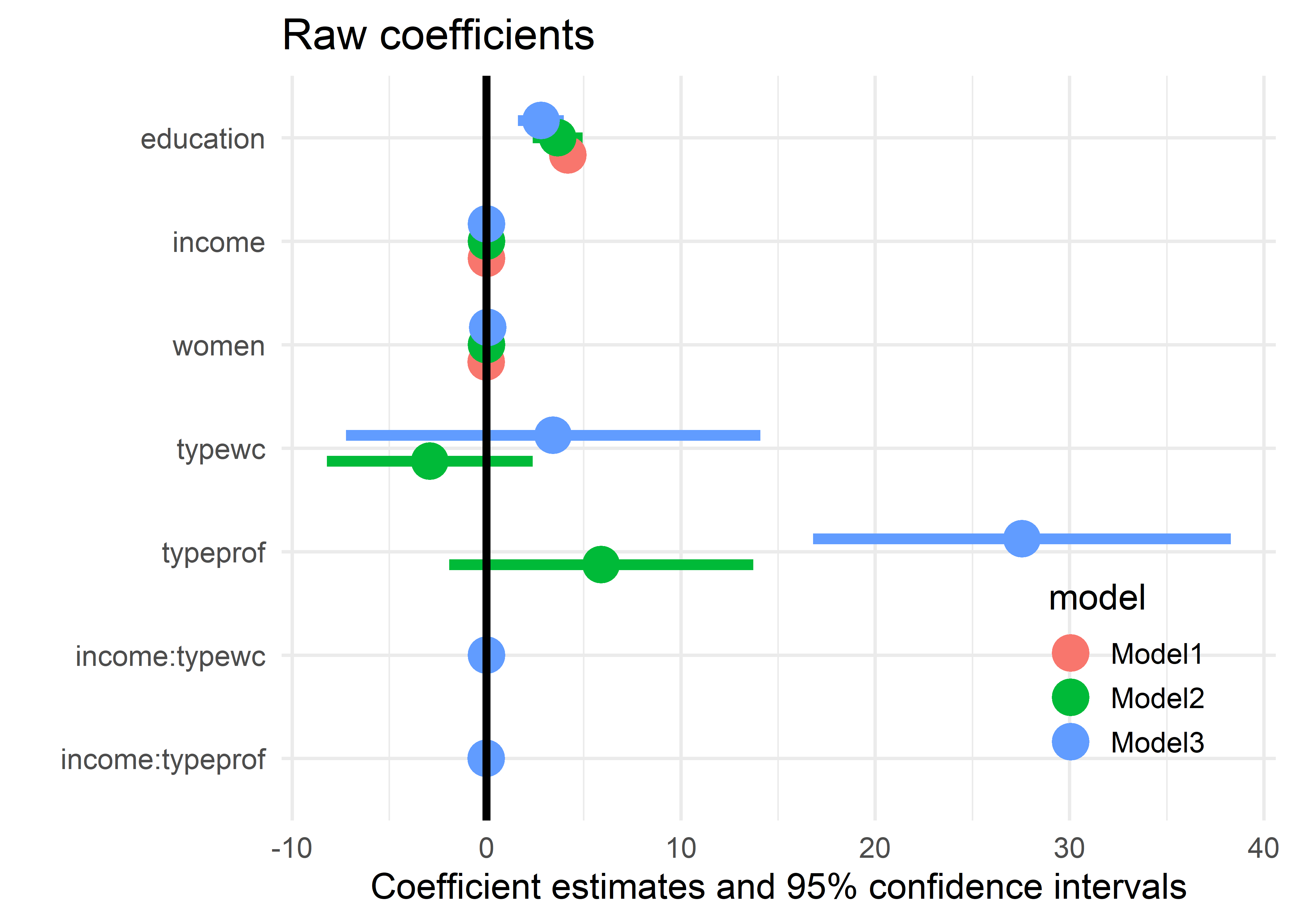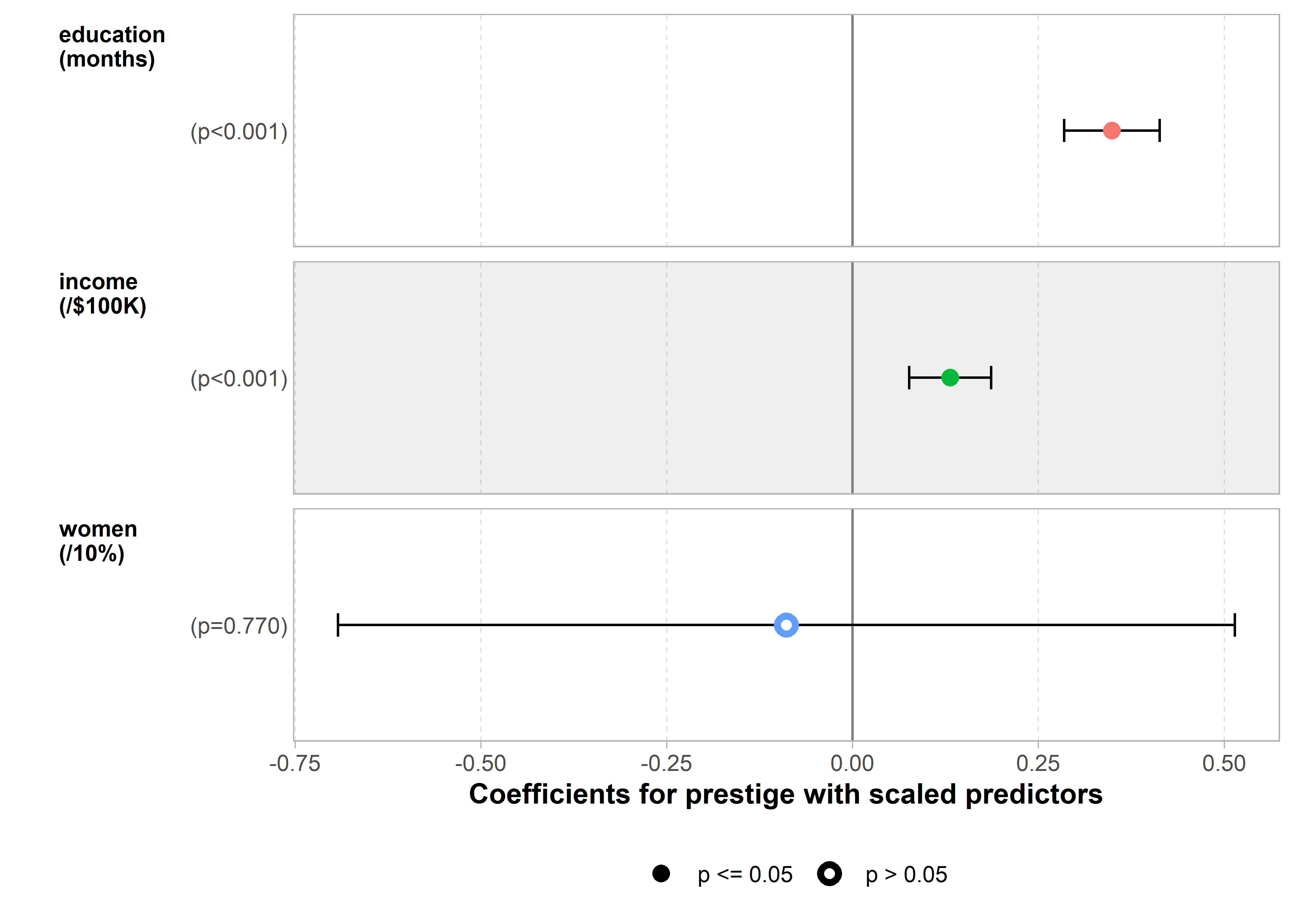 carandperformancedon’t just show problems; they label the troublemakers and guide you toward solutions.Coefficient plots make model comparisons effortless and honest: Raw coefficient tables hide the forest for the trees, especially when predictors have wildly different scales (years vs. dollars vs. percentages). Standardized coefficient plots and meaningful rescaling transform incomprehensible tables into intuitive visual comparisons. When Duncan’s income coefficient (0.0013) appears invisible next to education’s coefficient (4.19), the plot reveals they’re actually comparable forces shaping occupational prestige.
