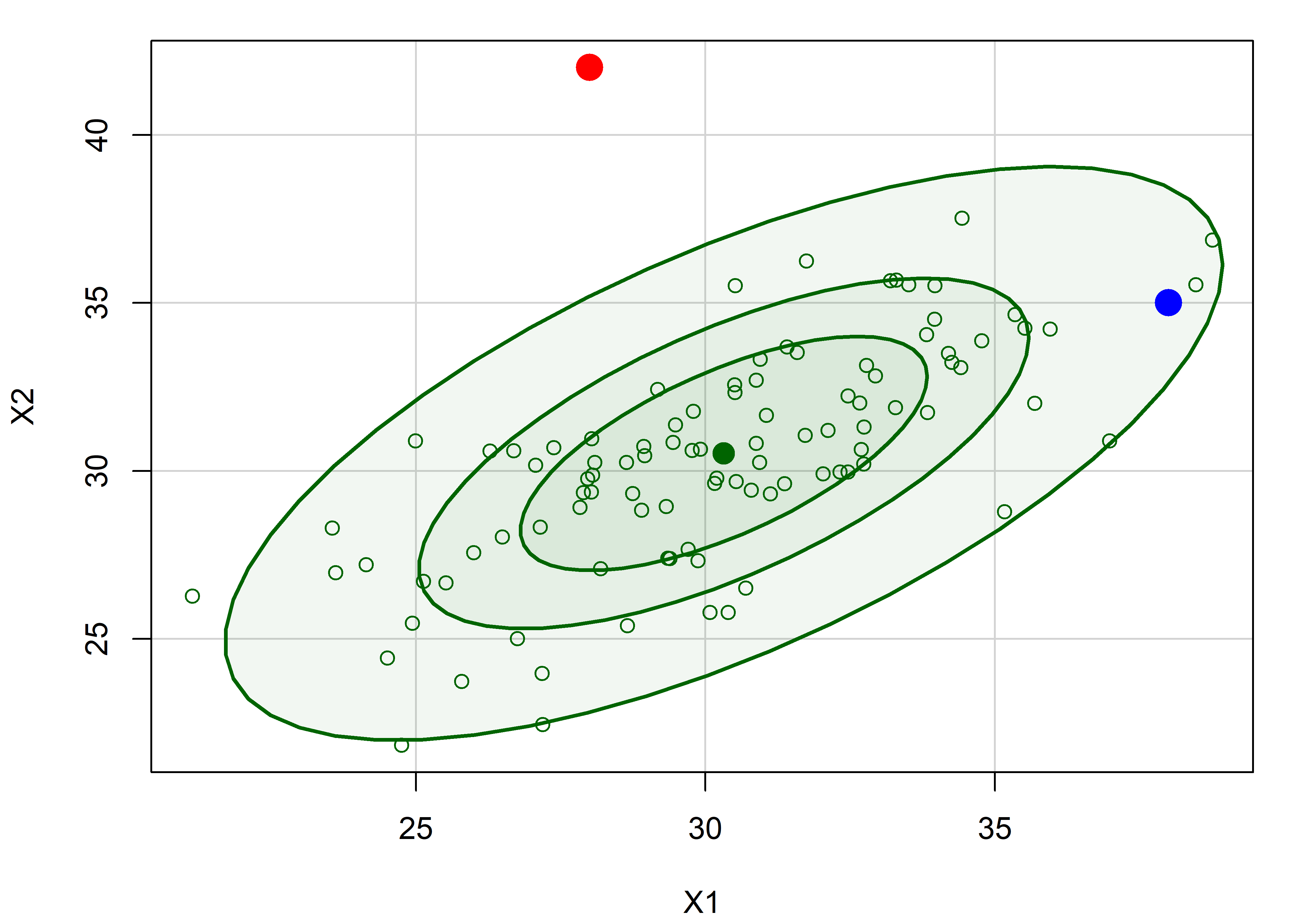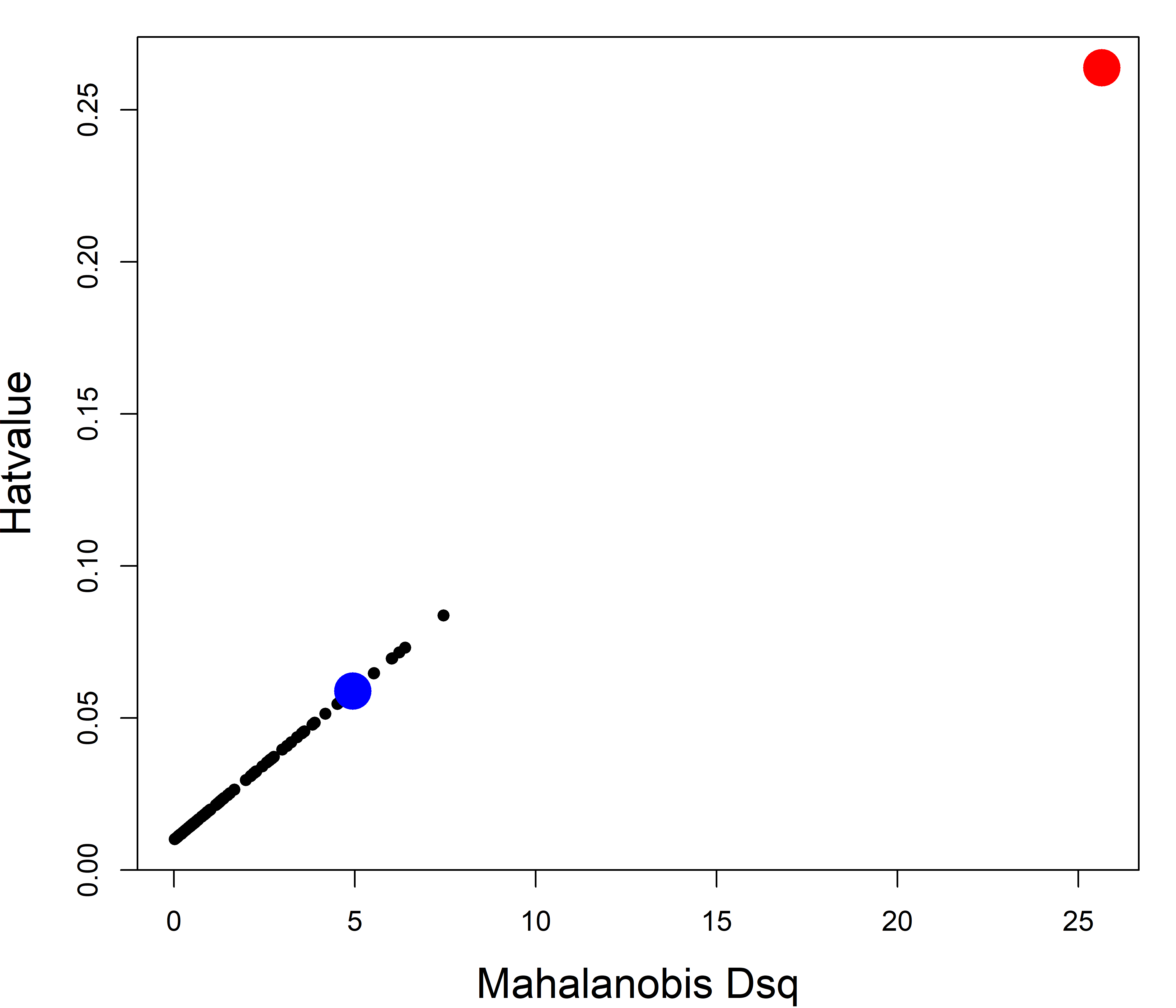 Look back at these two points in Figure 7.23. Can you guess how much further the red point is from the mean than the blue point? You might be surprised that its’ \(D^2\) and leverage are about five times as great!