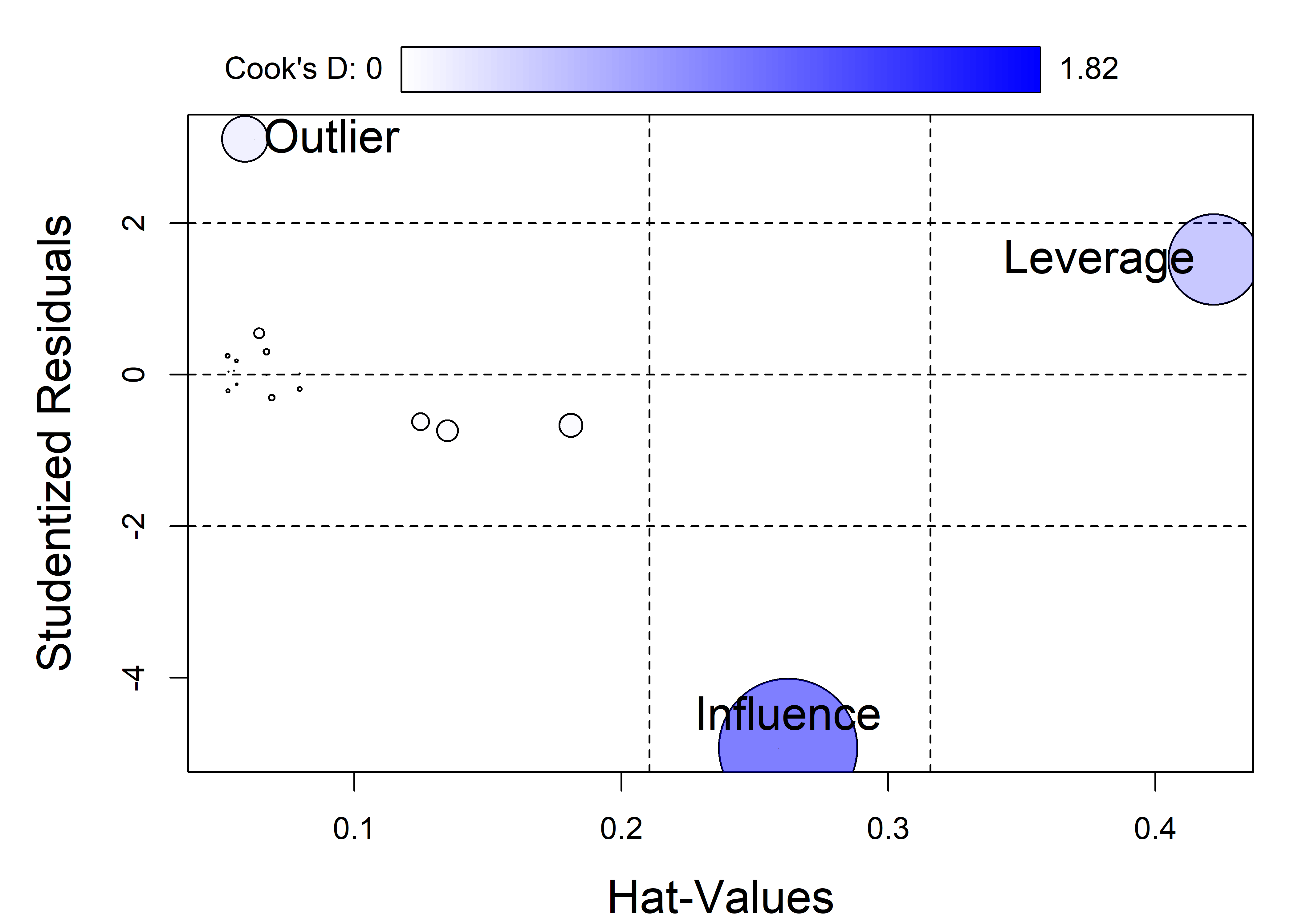 This is shown in Figure 7.25 for the demonstration dataset constructed in Section 7.5.1. In this plot, notable cutoffs for hatvalues at \(2 \bar{h}\) and \(3 \bar{h}\) are shown by dashed vertical lines and horizontal cutoffs for studentized residuals are shown at values of \(\pm 2\).