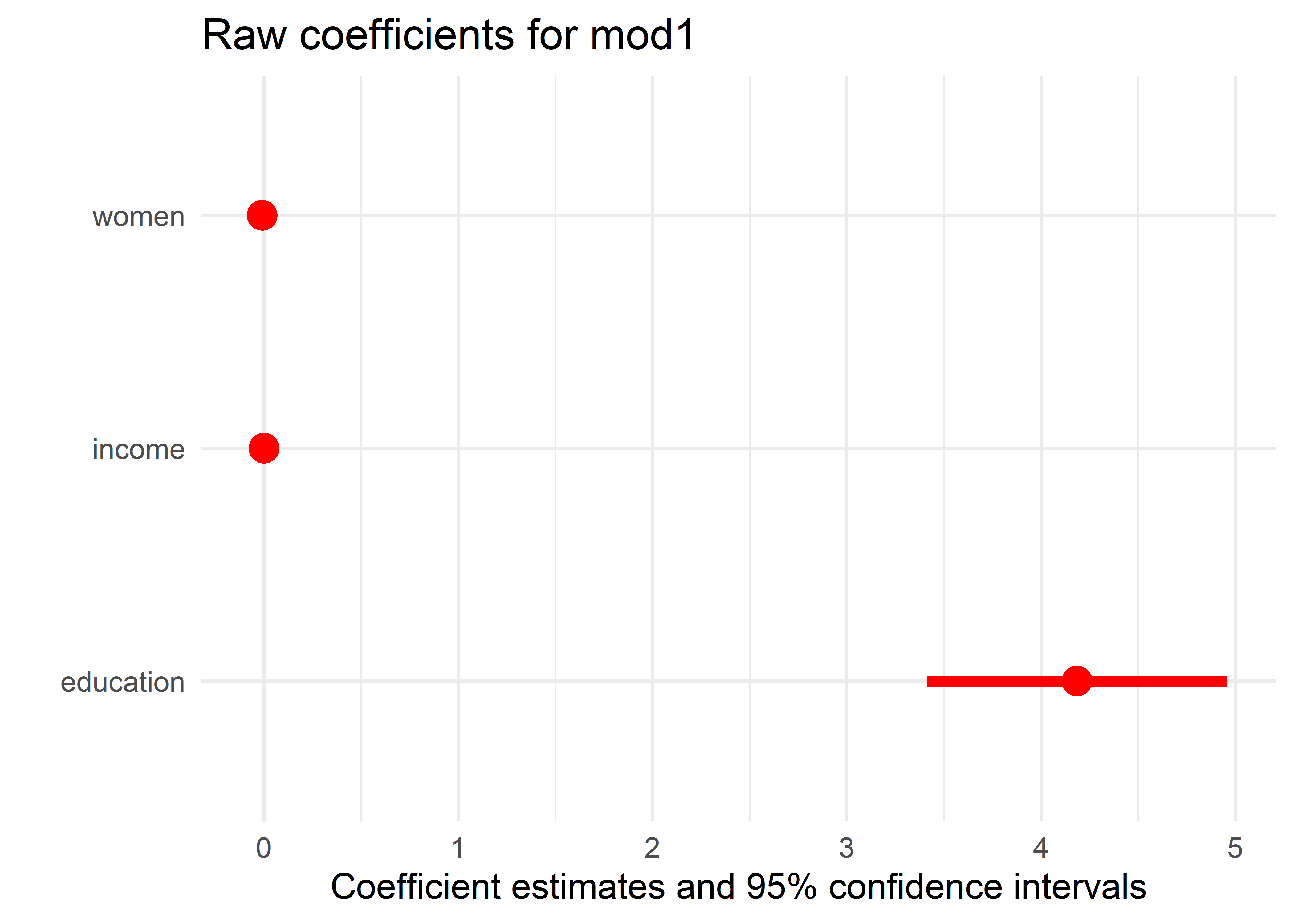 # F-statistic: 101 on 2 and 42 DF, p-value: <2e-16Beyond this, Duncan was interested in the coefficients and whether income and education could be said to have equal impacts on predicting occupational prestige. A nice display of model coefficients with confidence intervals is provided by parameters::model_parameters().