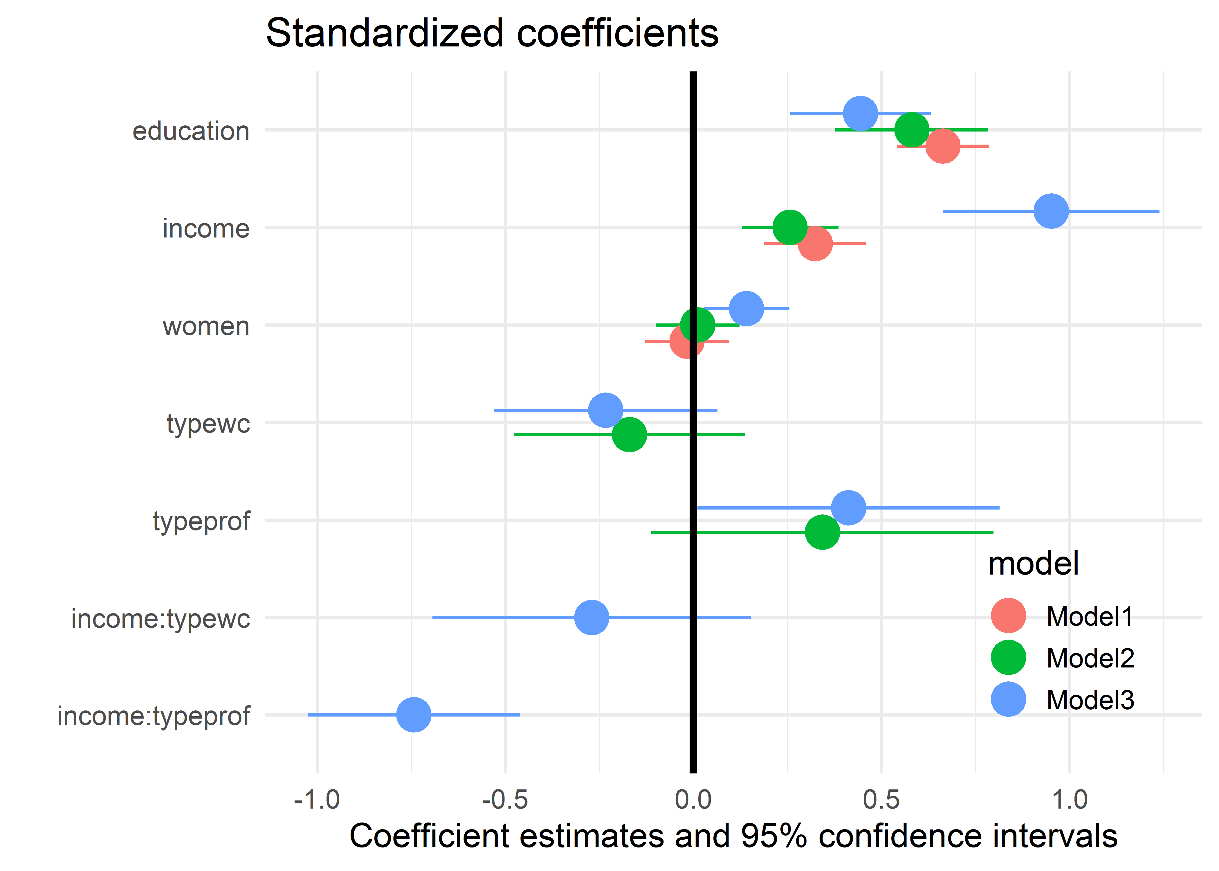 typein the dataset has its levels ordered alphabetically. For analysis and graphing it is useful to reorder the levels in the natural increasing order. An alternative is to maketypean ordered factor, but this would represent it using polynomial contrasts for linear and quadratic trends, which seems useful in this context. ↩︎This example was constructed by Georges Monette.↩︎