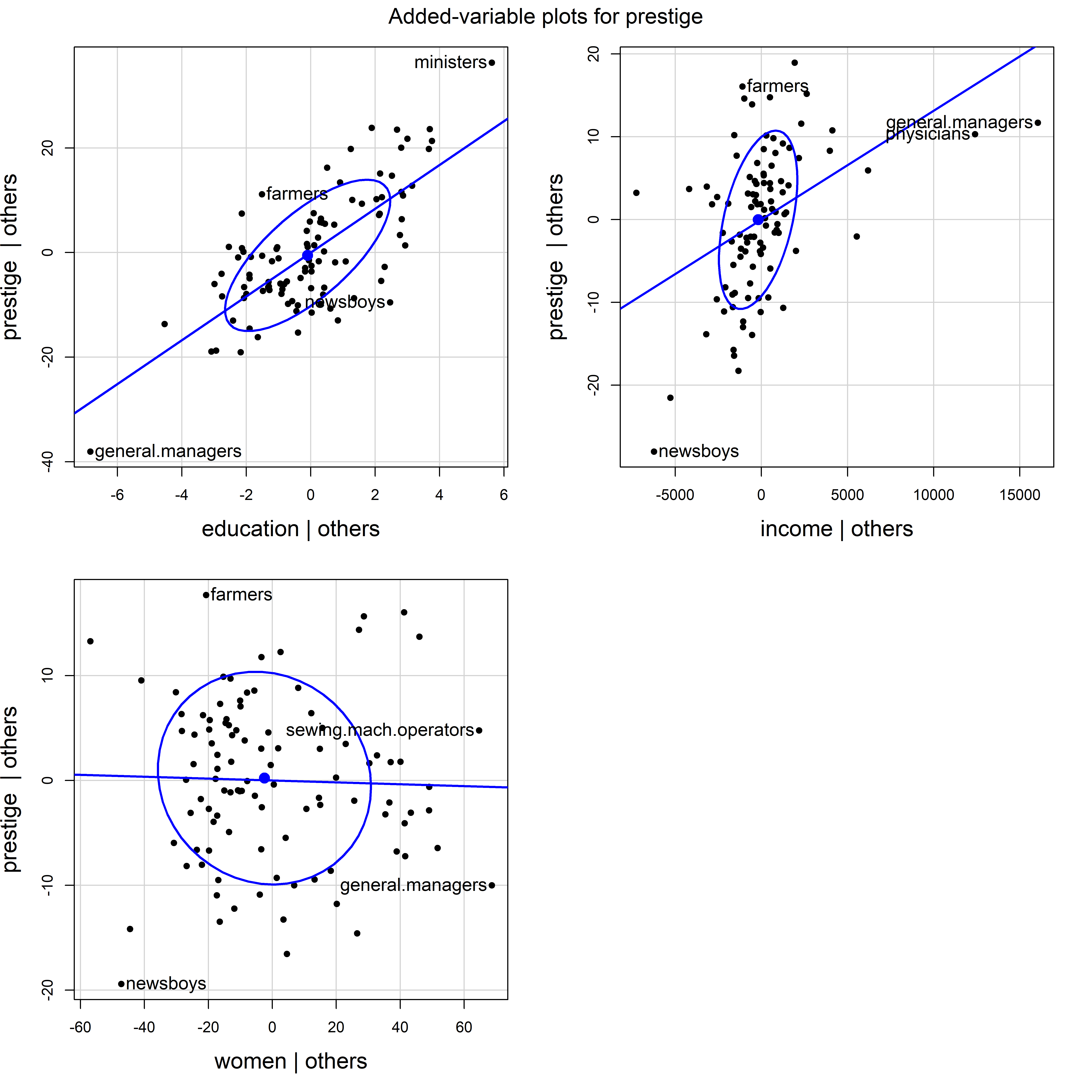 Among the others, reporter has a relatively large negative residual—its prestige is far less than the model predicts—but its low leverage make it not highly influential. railroad engineer has an extremely large hat value because its income is very high in relation to education. But this case is well-predicted and has a small residual, so its leverage is not large.