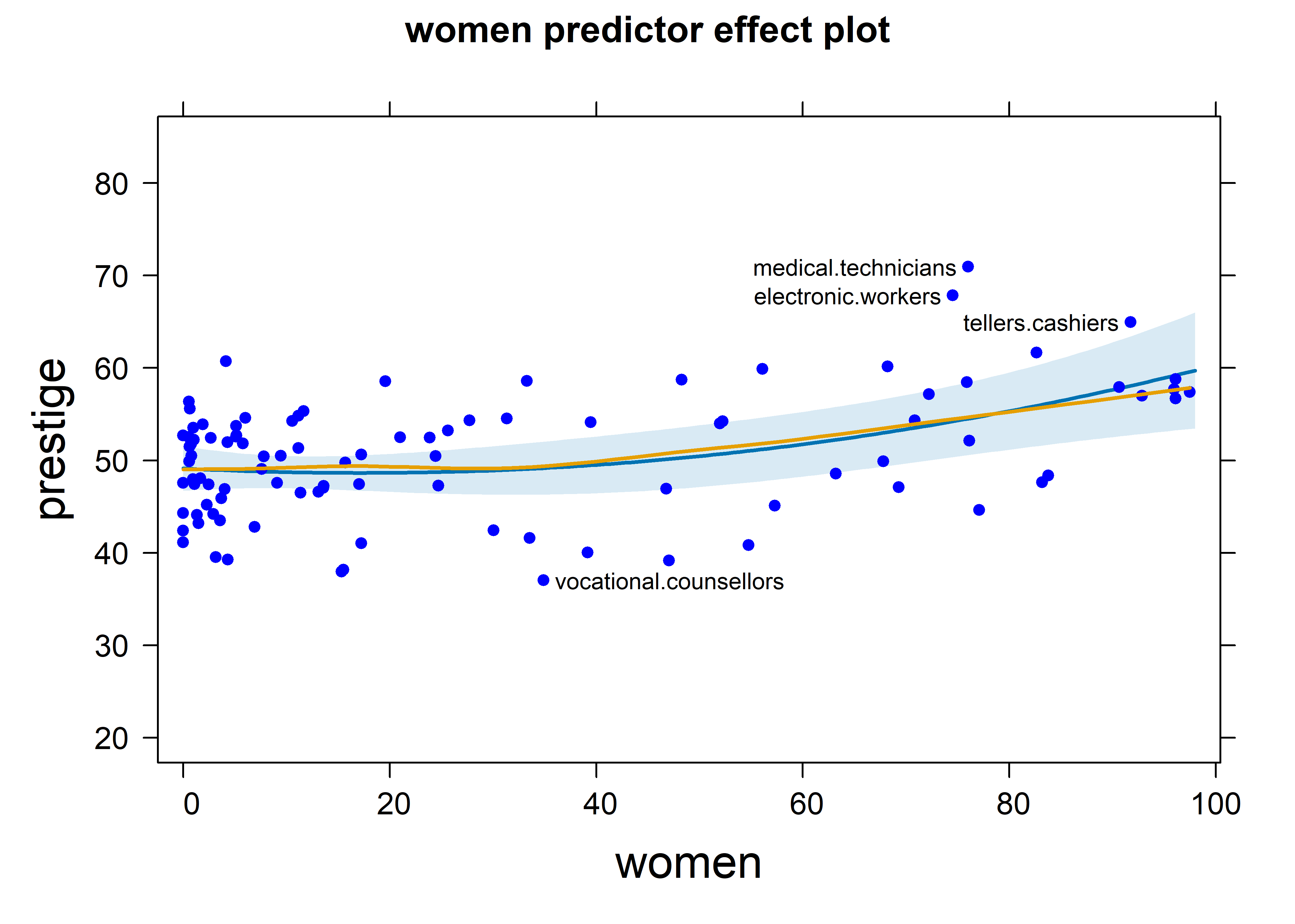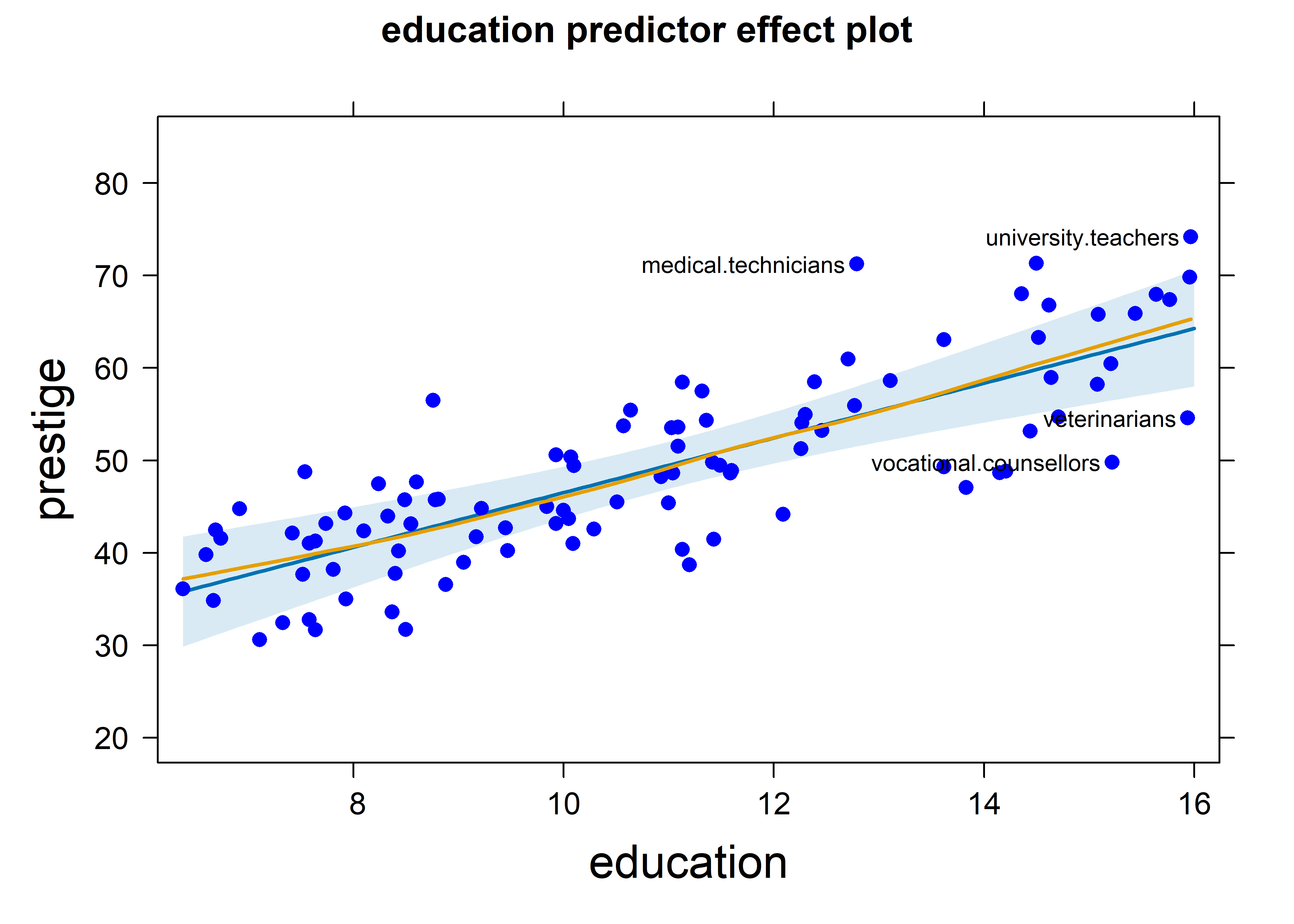 In a classic study in sociology, Duncan (1961) used data from the U.S. Census in 1950 to study how one could predict the prestige of occupational categories — which is hard to measure — from available information in the census for those occupations. His data is available in carData:Duncan, and contains