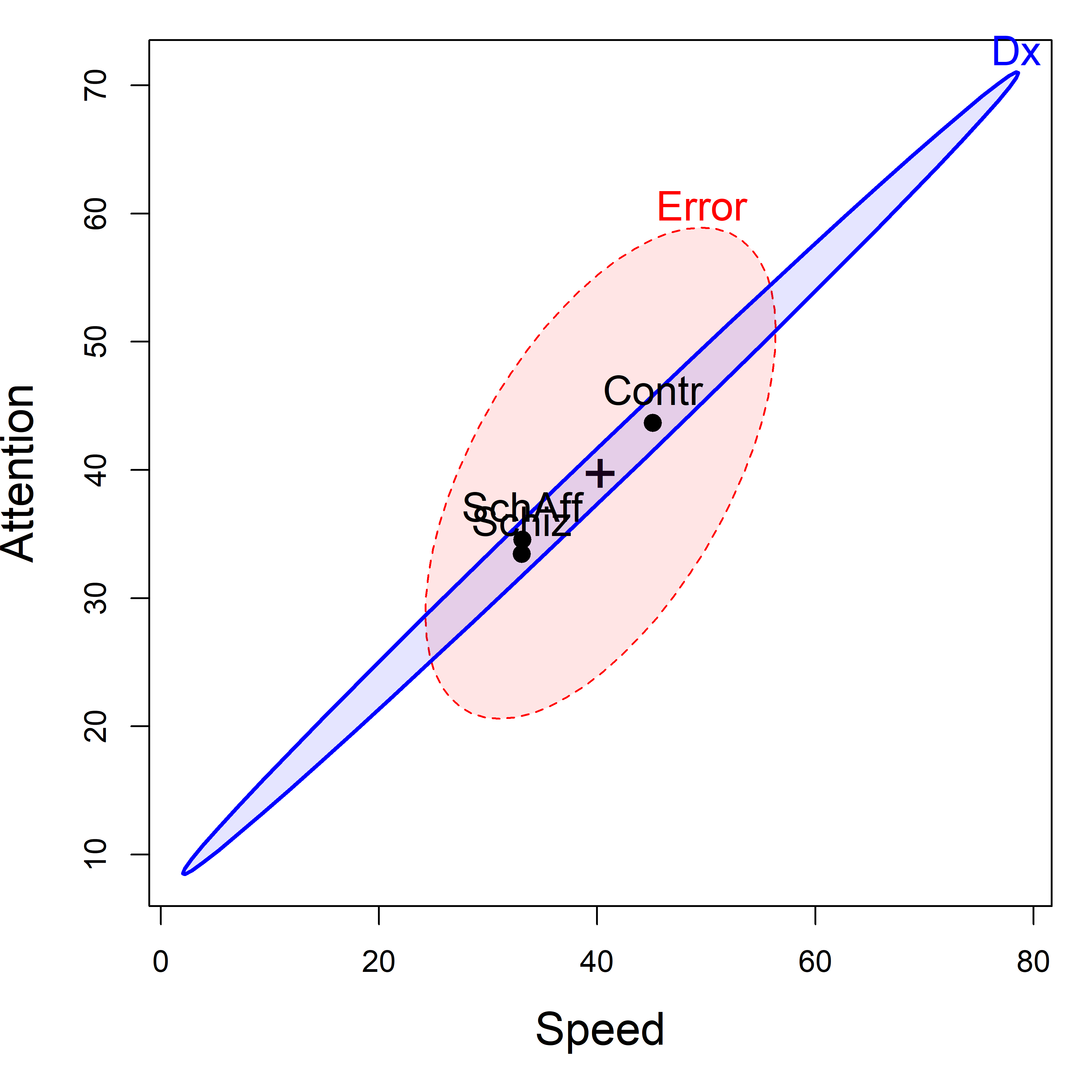 shows the visualization of the multivariate model in the space of two response variables (the first two by default). The result (Figure fig-NC-HEplot) tells a very simple story: The control group performs higher on higher measures than the diagnosed groups, which do not differ between themselves.