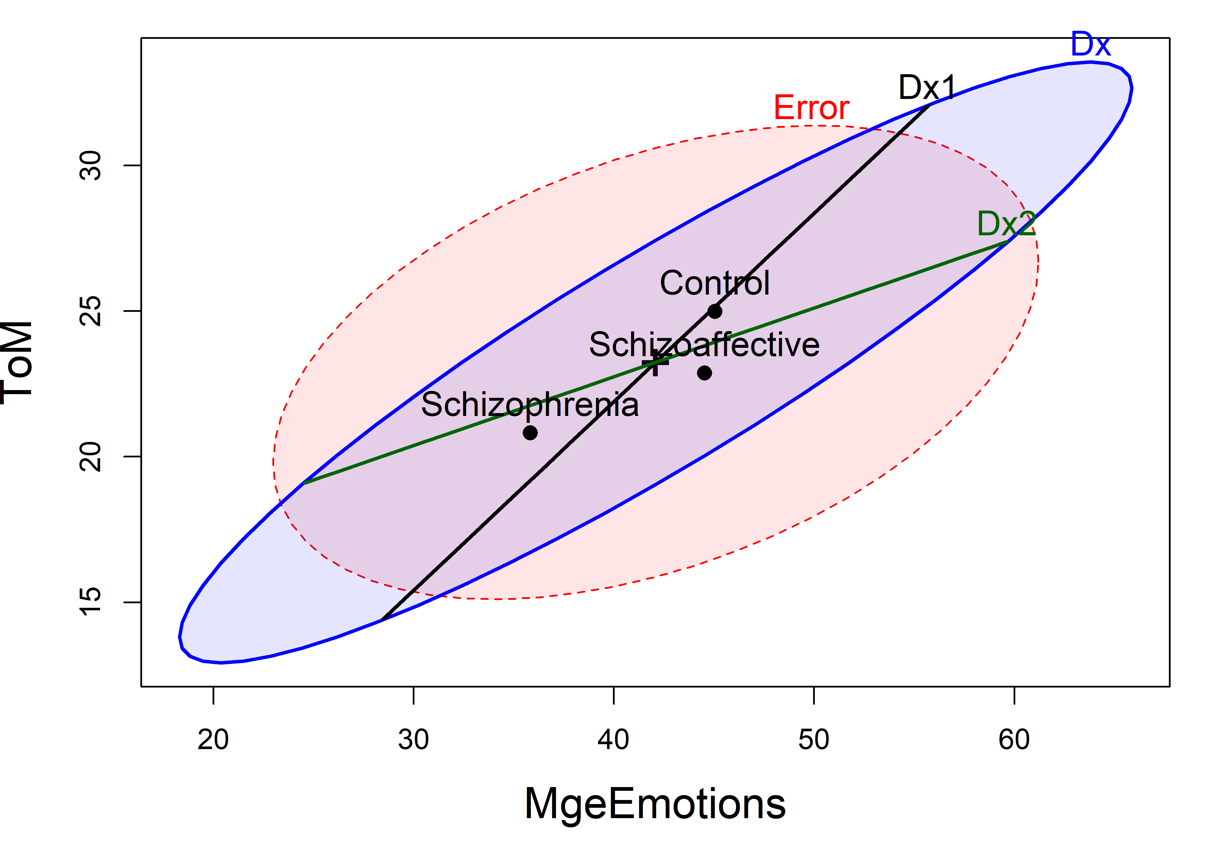 The interpretation of Figure fig-NC-candisc is again fairly straightforward. As noted earlier (sec-candisc), the projections of the variable vectors in this plot on the coordinate axes are proportional to the correlations of the responses with the canonical scores. From this, we see that the normal group differs from the two patient groups, having higher scores on all the neurocognitive variables, most of which are highyl correlated. The problem solving measure is slightly different, and this, compared to the cluster of memory, verbal and attention, is what distinguishes the schizophrenic group from the schizoaffectives.