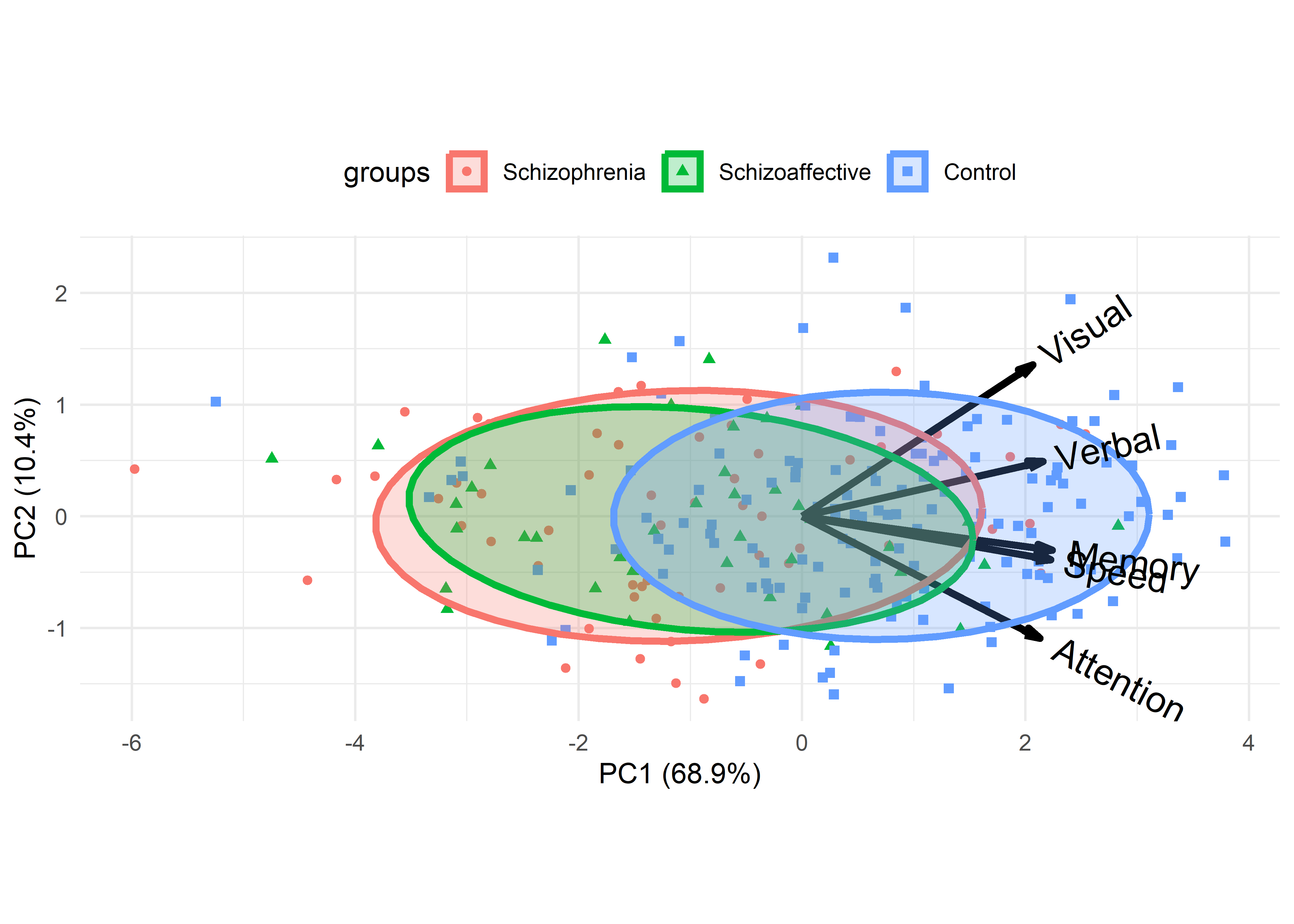 The separation of the groups is essentially one-dimensional, with the control group higher on all measures. Moreover, the variables processing speed and visual memory are the purest measures of this dimension, but all variables contribute positively. The second canonical dimension accounts for only 1.5% of group mean differences and is non-significant (by a likelihood ratio test). Yet, if we were to interpret it, we would note that the schizophrenia group is slightly higher on this dimension, scoring better in problem solving and slightly worse on working memory, attention, and verbal learning tasks.