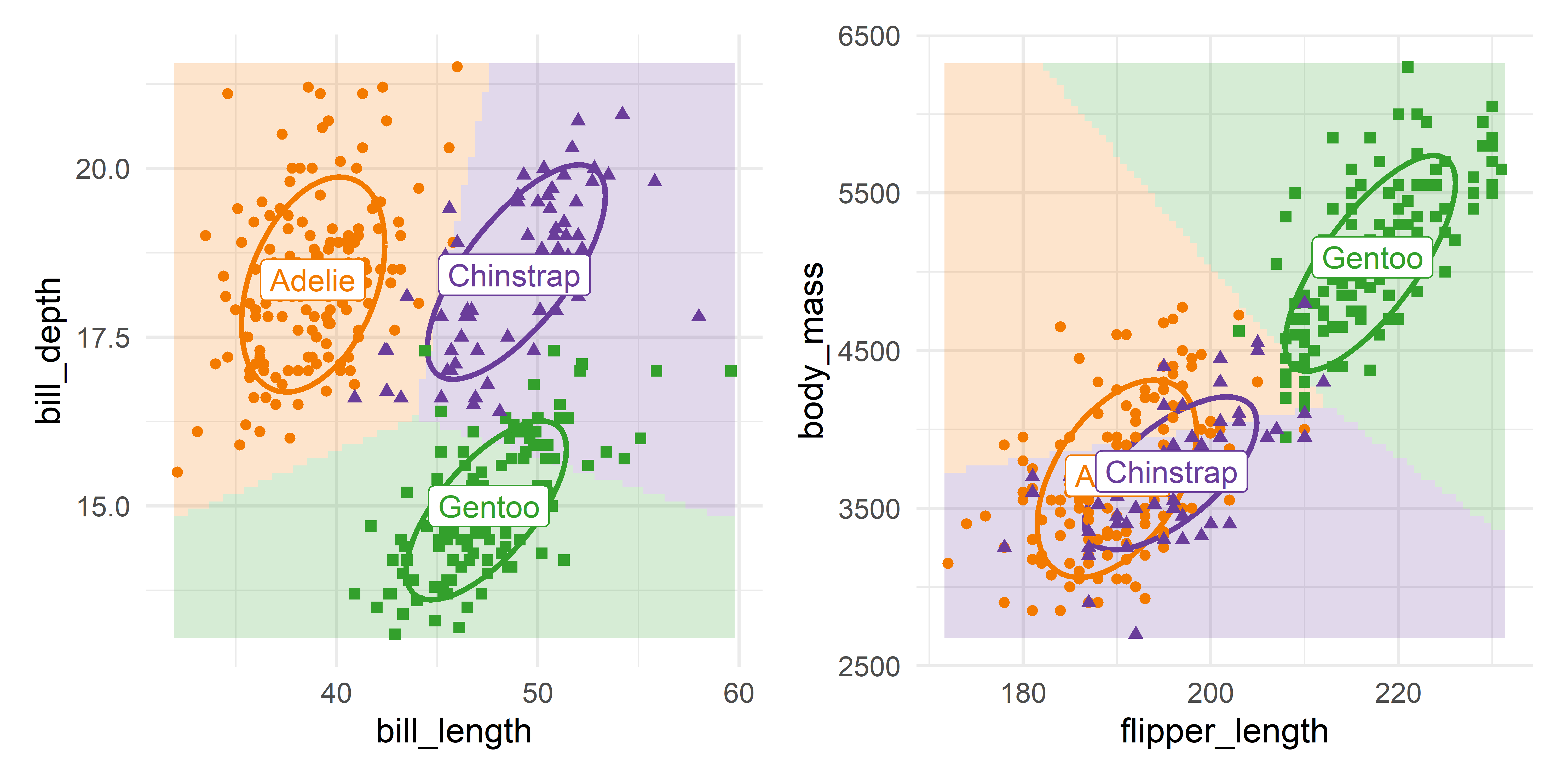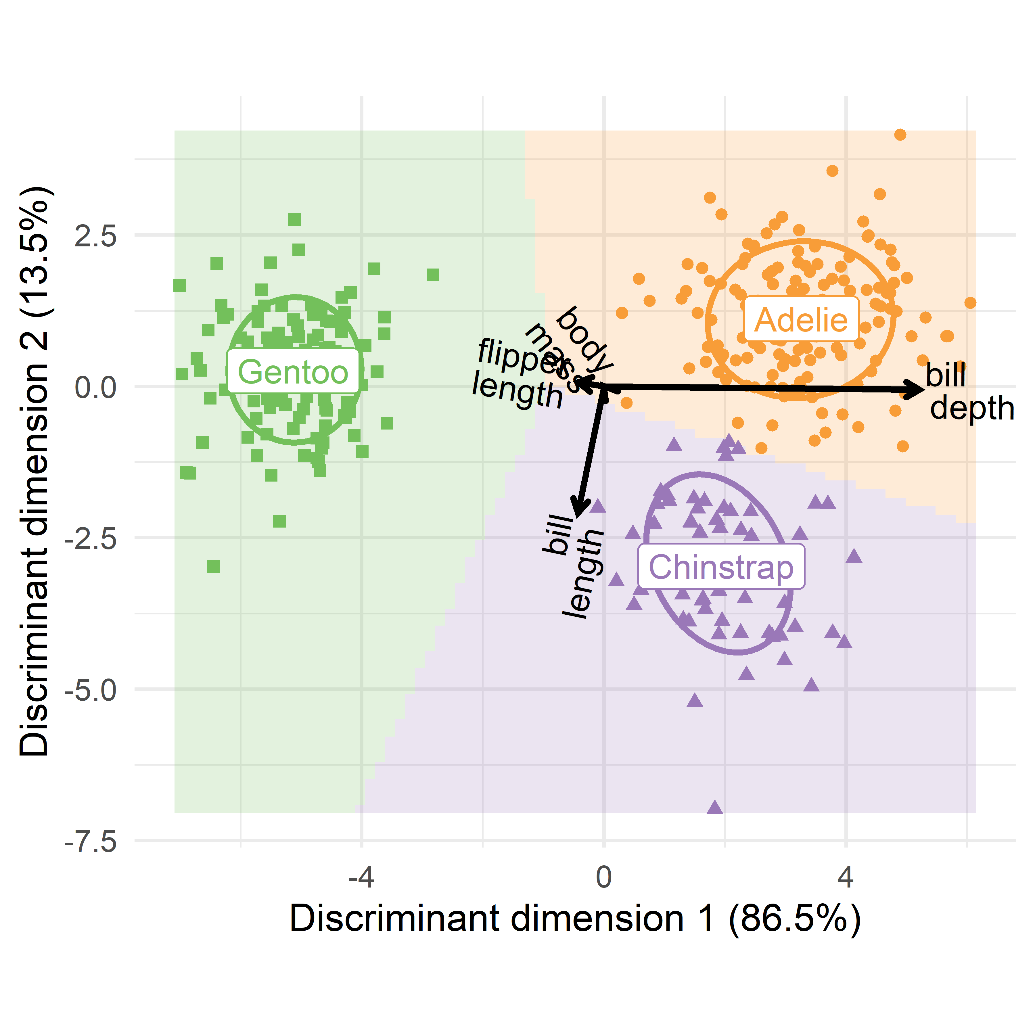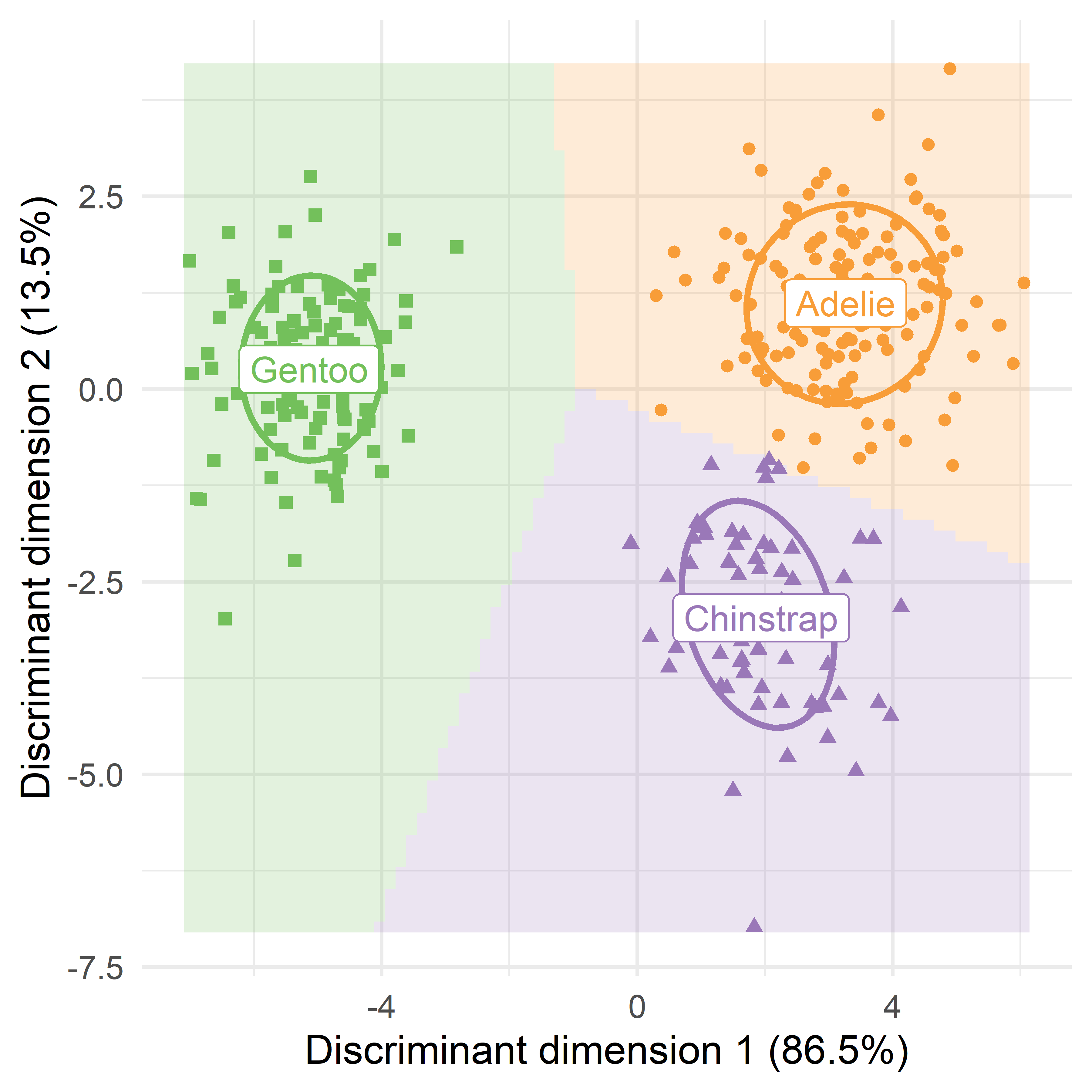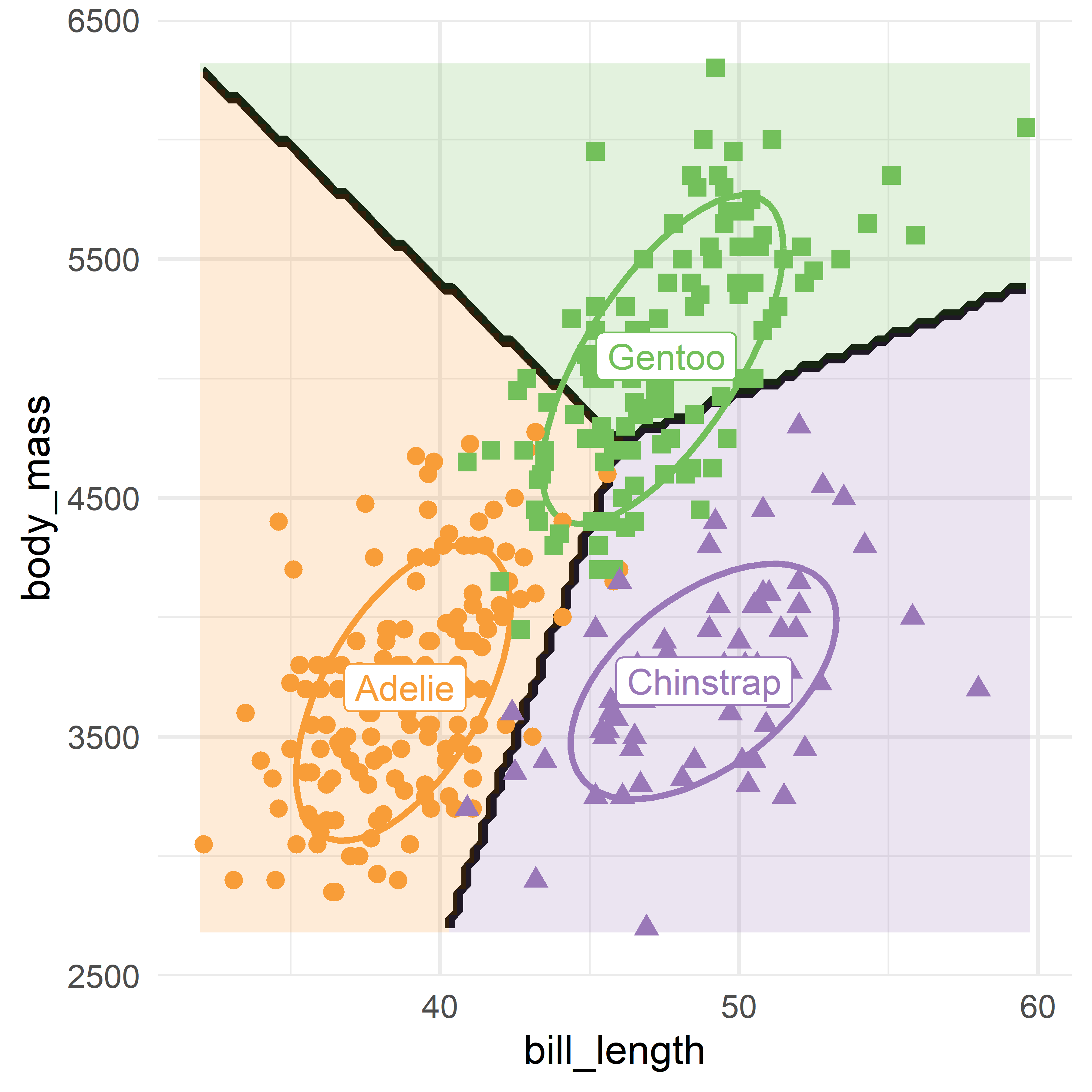 Then you can follow the earlier examples in data space: Set up a grid of values for LD1 and LD2 over the discriminant space of peng_scored and obtain the predicted classifications for each point.