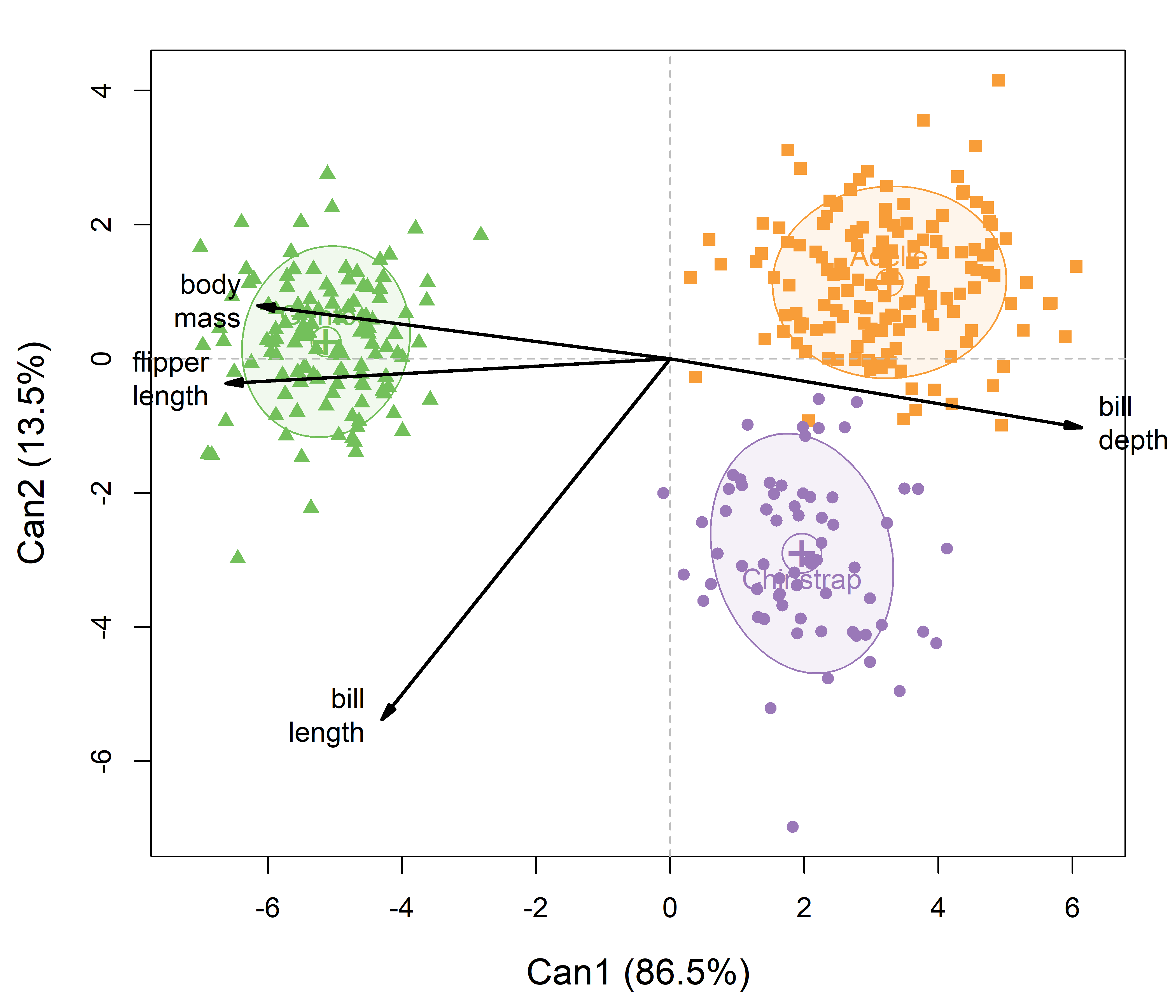 To interpret such plots, first consider the separation among the groups on a given dimension, and then how the variable vectors point on this dimension. In Figure A.8, the first canonical dimension largely separates the Gentoos on the left from Adélie and Chinstrap on the right. This dimension is positively aligned with bill_depth, so these two groups have straighter bills than the Gentoo. But, the Gentoos tend to have larger body mass and longer flippers. The second dimension distinguishes mostly between the Adélie and Chinstraps, where the Chinstraps tend to have longer bills.