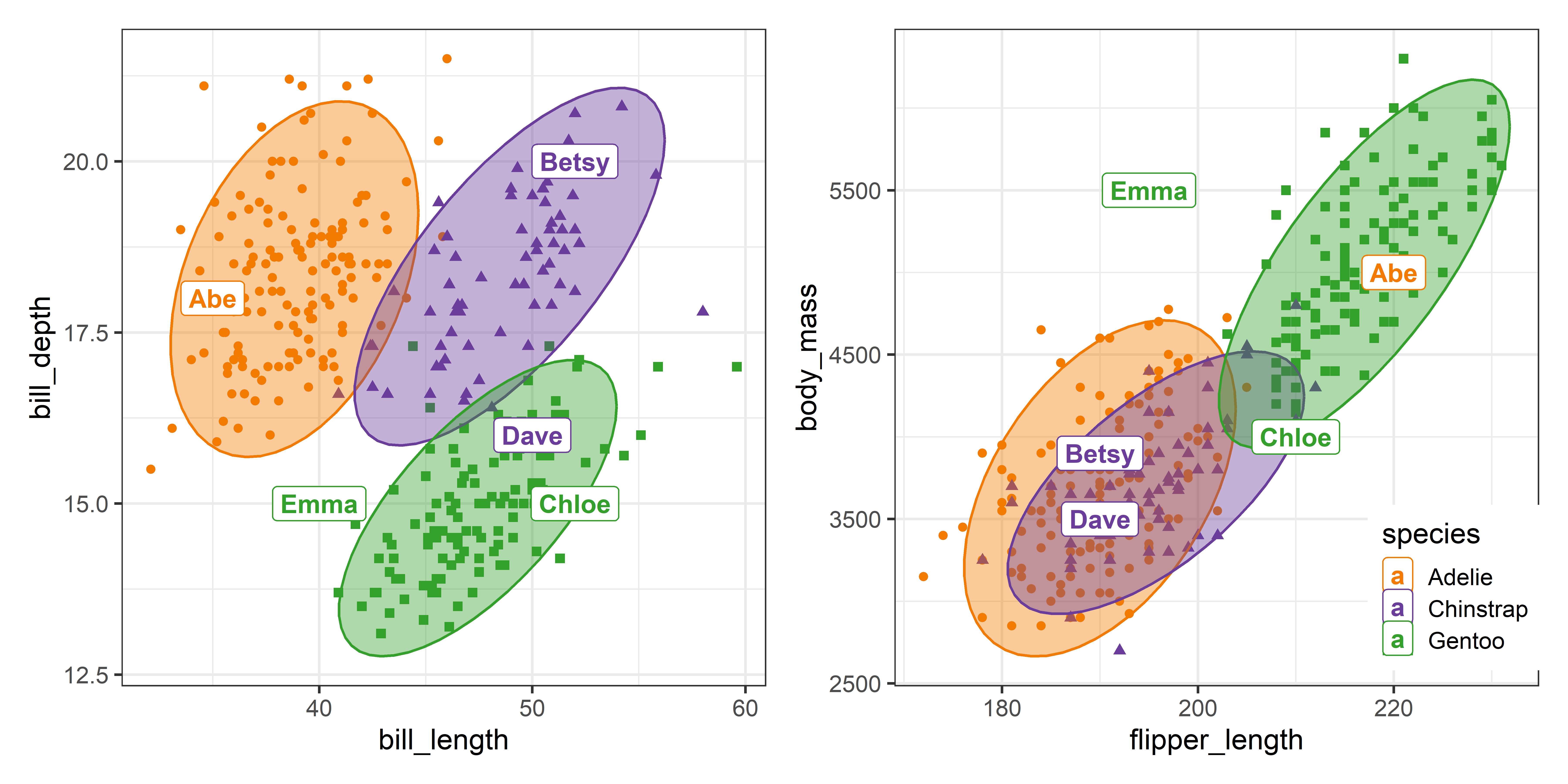 # 6 32.1 13.6 1Then, in the plotting steps, geom_tile() is used to display the predictions in the pred_grid dataset, using the penguin colors for the species. Points and other layers use the full peng dataset. I also calculate the means for each species and use these as direct labels for the groups, to avoid a legend.