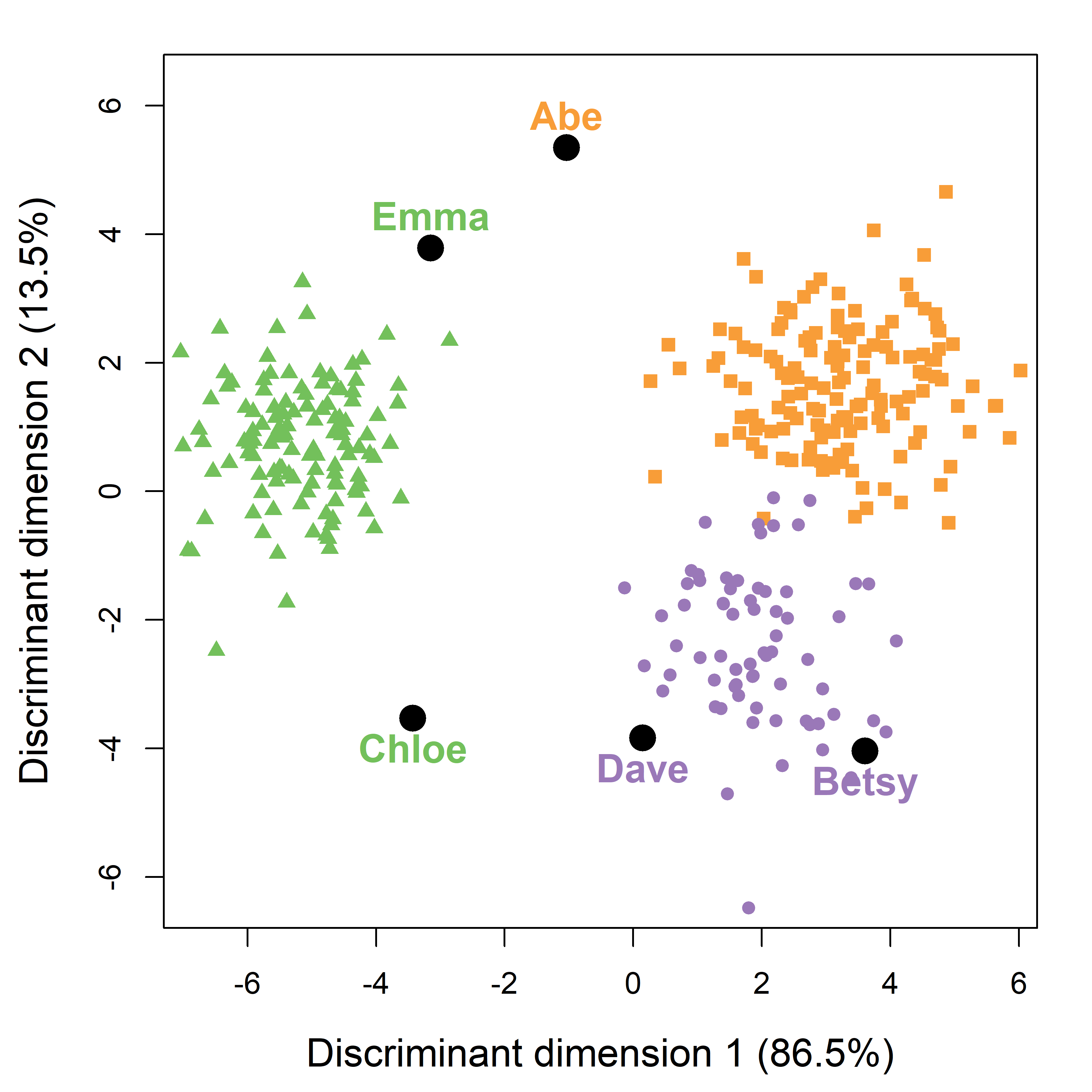 For an example, to illustrate how discriminant analysis works and how to use it to classify observations, imagine you are a researcher on an expedition to Antarctica to survey the penguin population. You stop at a small, as yet unnamed island “Z”, and find five penguins you want to study. You call them Abe, Betsy, Chloe, Dave and Emma. How can you determine their species based on what you know of the penguins studied before?