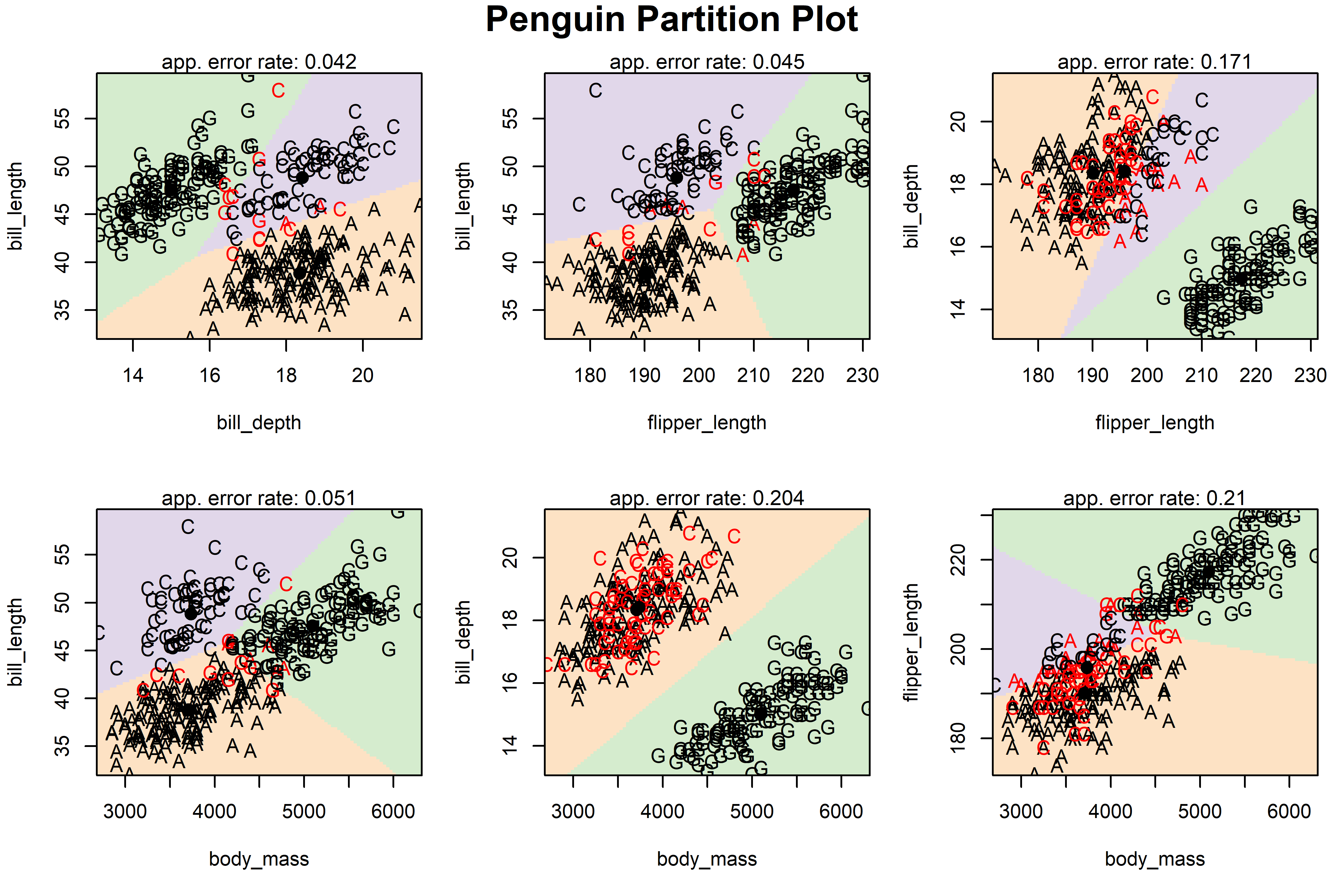 klaR::partimat()was designed to emphasize the classification accuracy shown in each pairwise plot, also printed as an error rate for each plot. You can see, for example that the plot ofbody_massagainstbill_depthin row 2, column 2 of Figure A.4 shows only two distinct regions, for Adélie and Gentoo. All the Chinstraps appear mixed in with the Adélies and, giving an error rate of 0.204 in this plot. Two other panels also show high error rates.↩︎