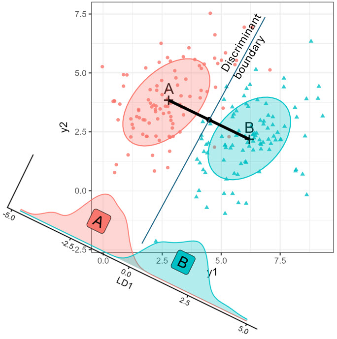 - For classification, LDA provides a line in this space which is the boundary between points that would be classified as belonging to groups “A” or “B”.