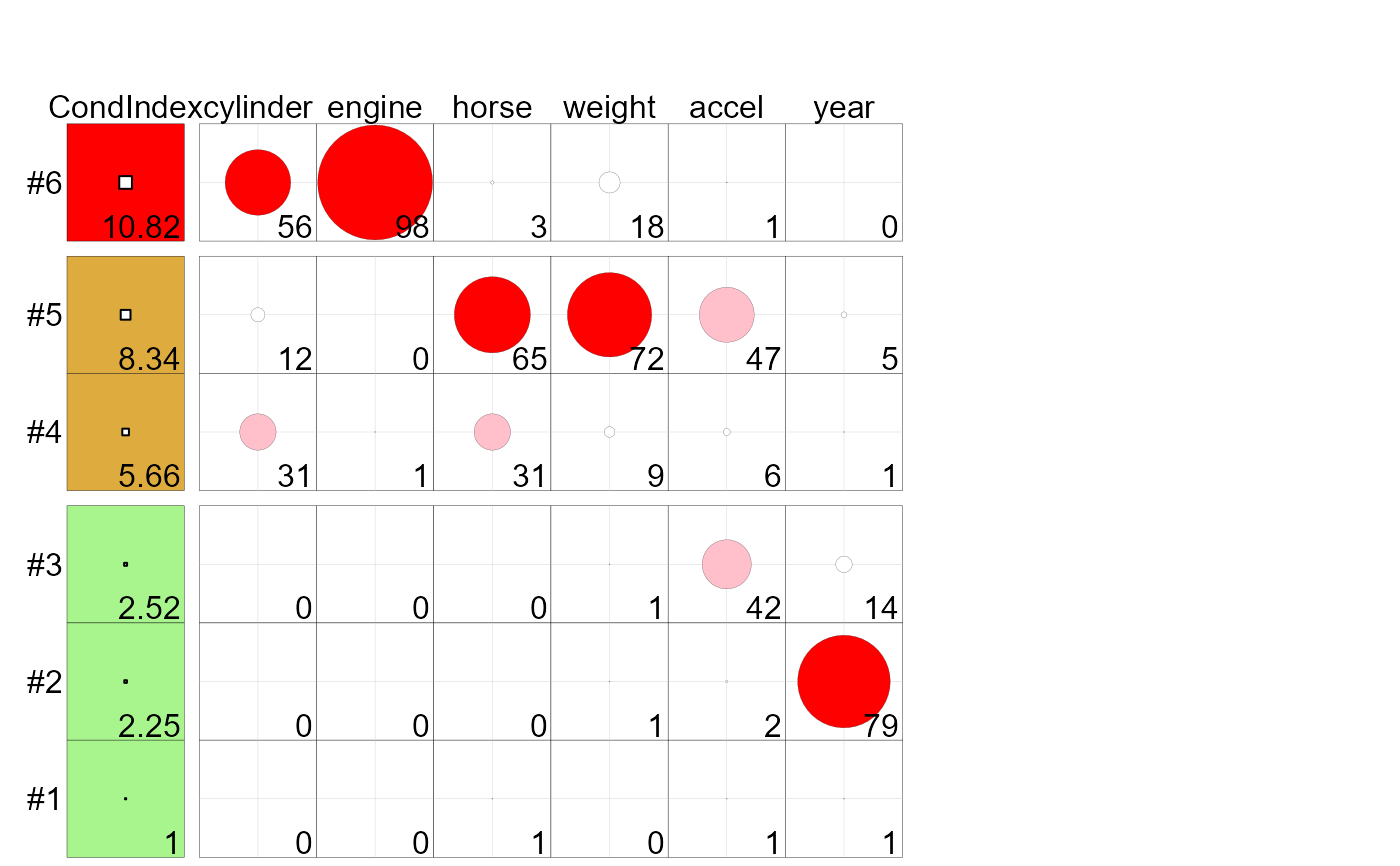 These methods produce a tableplot of collinearity diagnostics, showing the condition indices and variance
