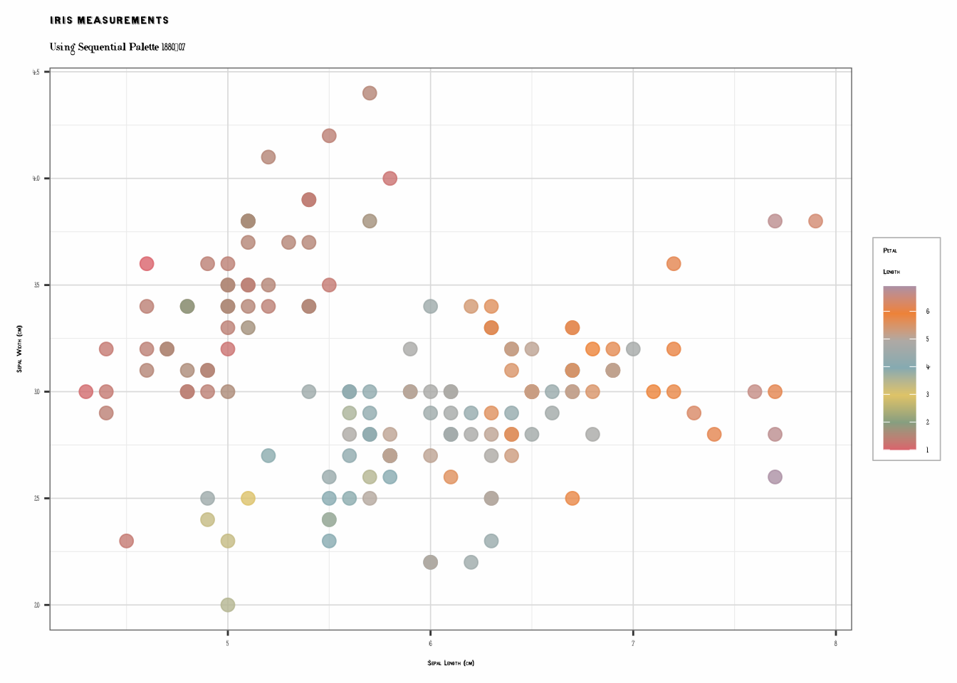 p1 <- ggplot(iris, aes(Sepal.Length, Sepal.Width, color = Petal.Length)) +
