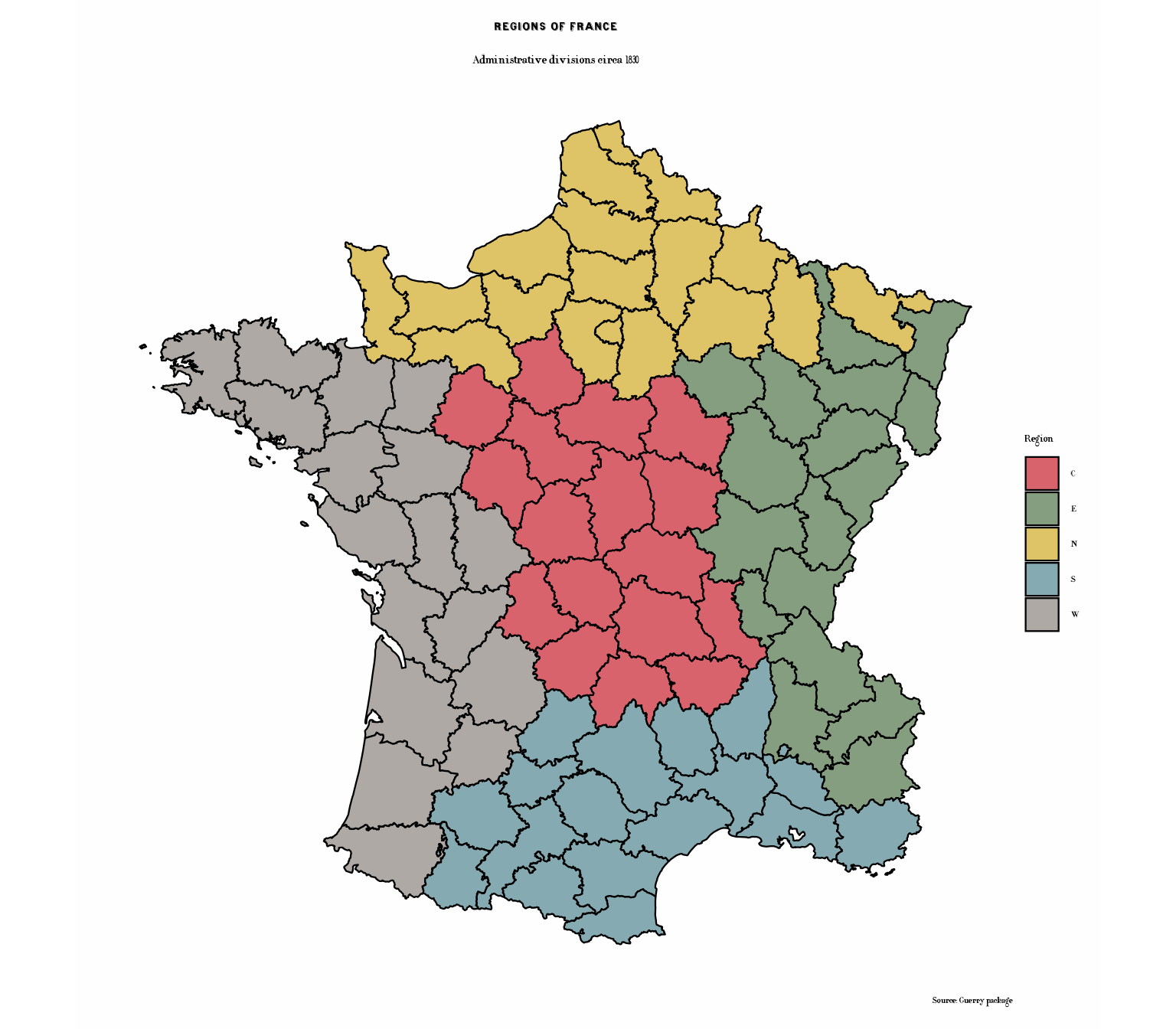 - Historical data: Guerry’s groundbreaking social statistics from 1830s France