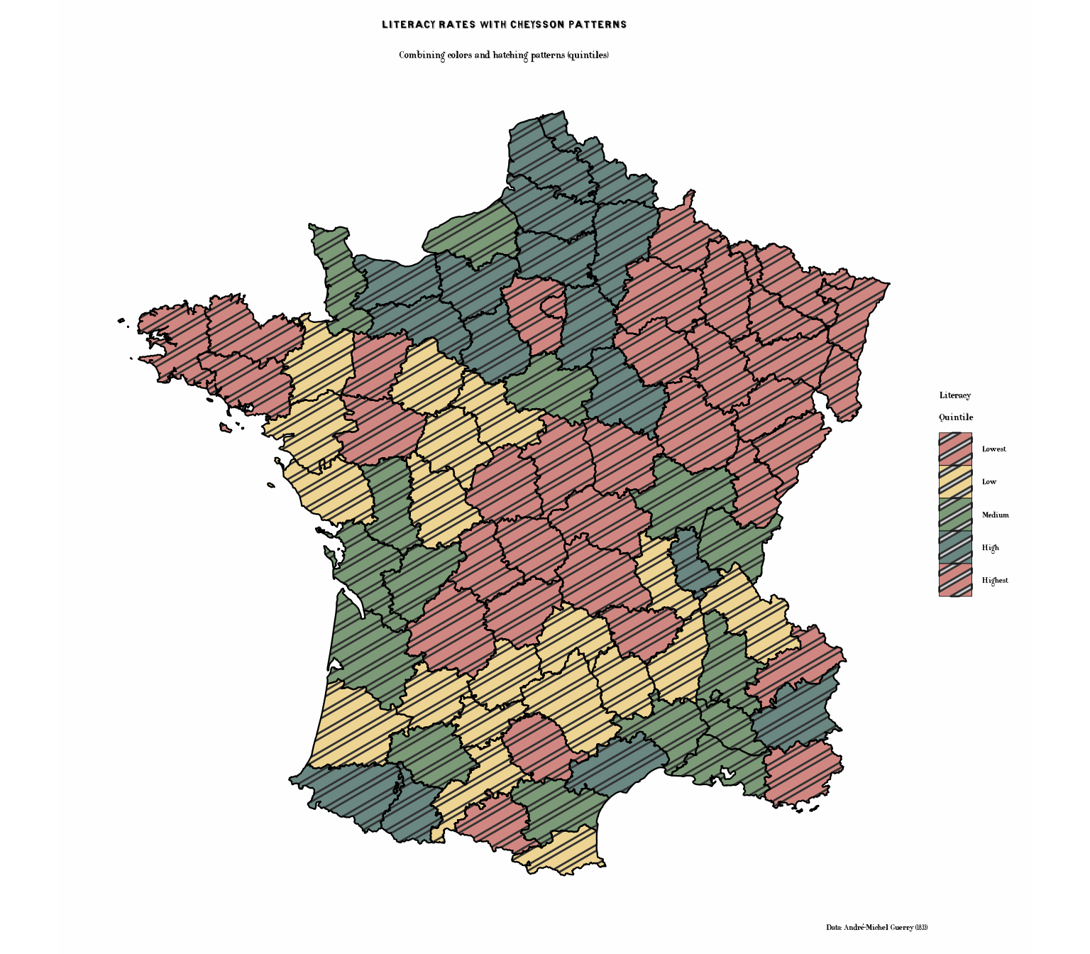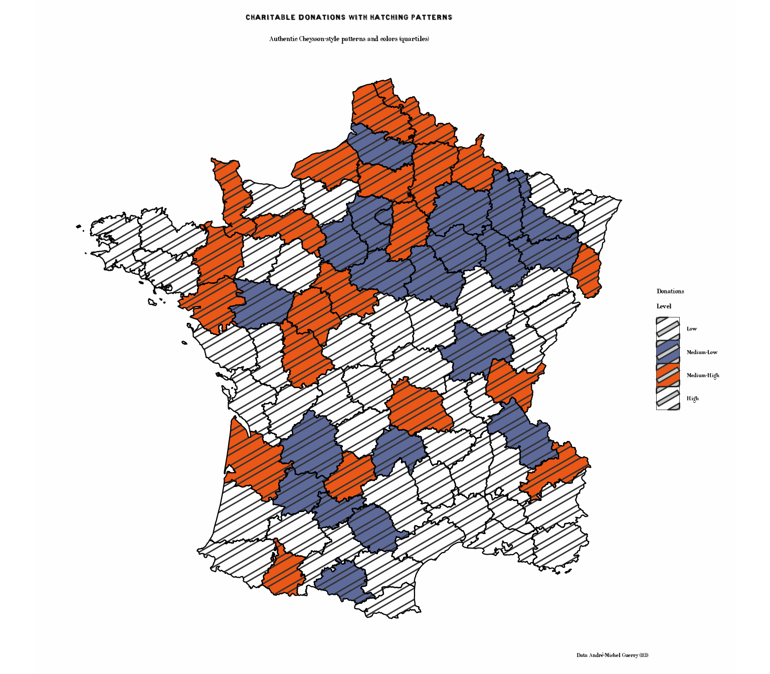 The pattern-enhanced maps (literacy, donations, and regions) showcase Cheysson’s most distinctive cartographic innovation: combining colors with hatching patterns. This dual encoding: