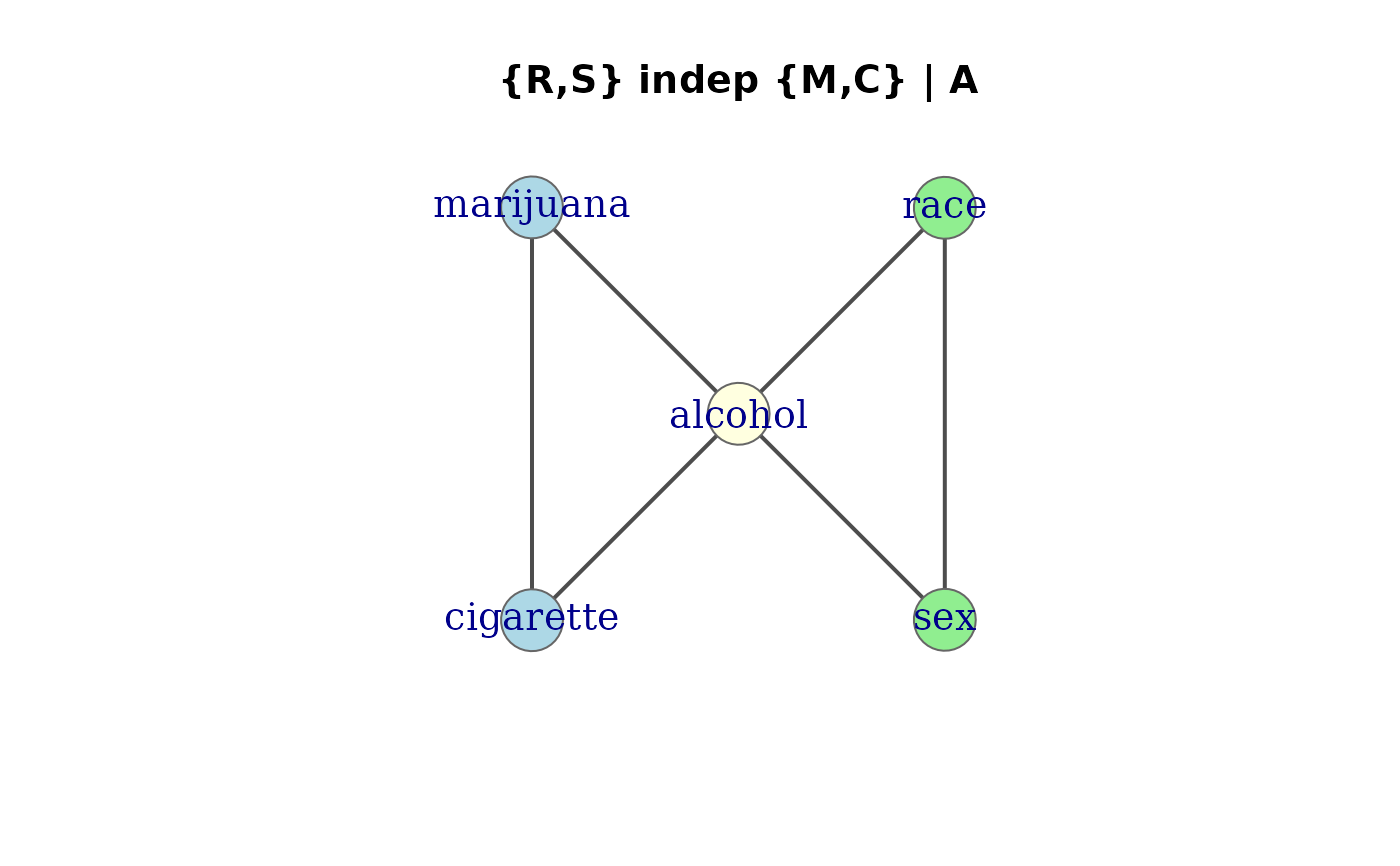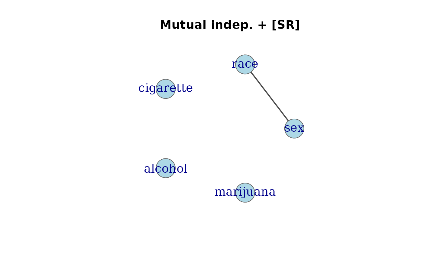 #> Edges: cigarette -- alcohol, cigarette -- marijuana, alcohol -- marijuana, alcohol -- sex, alcohol -- race, sex -- race