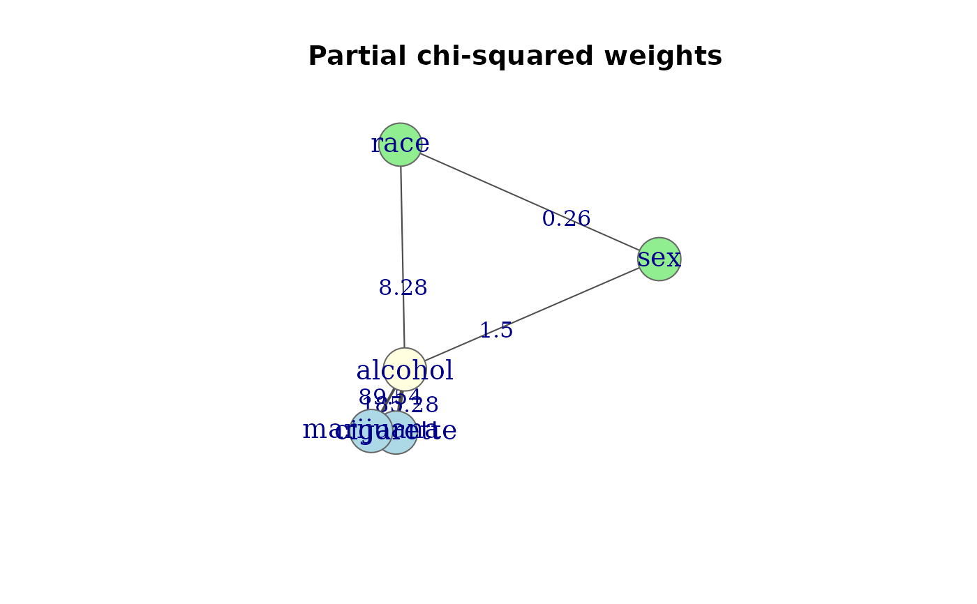#> Edges: cigarette -- alcohol (185.28), cigarette -- marijuana (494.9), alcohol -- marijuana (89.54), alcohol -- sex (1.5), alcohol -- race (8.28), sex -- race (0.26)