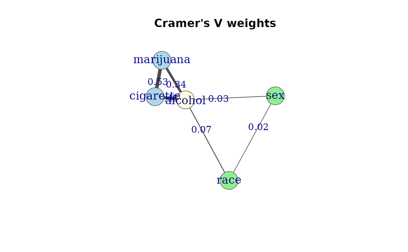 #> Edges: cigarette -- alcohol (0.45), cigarette -- marijuana (0.53), alcohol -- marijuana (0.34), alcohol -- sex (0.03), alcohol -- race (0.07), sex -- race (0.02)